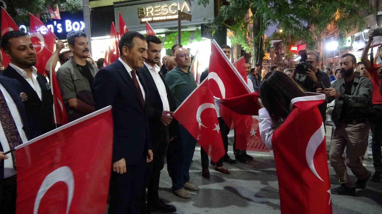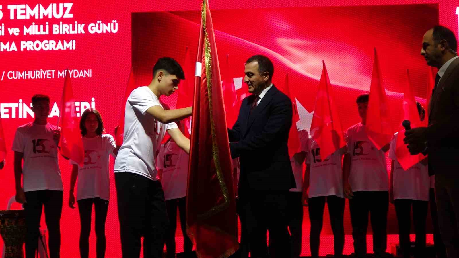 Vali Dr. Türker Öksüz konuşmasında; “Necip Türk milleti için 15 Temmuz 2016 tarihi bu nevi bir milat, bir mihenktir. Sureti haktan görünerek on yıllar boyunca kutsal değerlerimizi istismar etmekten çekinmeyen FETÖ’nün kamuflaj giymiş militanları, son ve akıl almaz bir cüretle bağımsızlığımıza kast etme teşebbüsünde bulunmuşlardır. Üç bin yıllık tarihimizde bize düşmanlık etme cesareti gösterebilenlerin bildiği ve fakat akıl tutulması yaşayan bu güruhun ön göremediği şey damarlarında Türk kanı taşıyan aslanların ve havsaların vatan uğruna can alıp can vermeye daima hazır olma hasletiydi. Cümle cihan bilir ki savaş Türk’ün düğünüdür. Şerefle ölmeyi, ayağında prangayla korkakça yaşamaya yeğ tutan milyonların, ’Ölürsek cennet bizim, kalırsak devlet bizim’ diyerek akın akın sokaklara dökülüşünü hatırlayın. O gece aralarında, yıllarını Terörle Mücadeleye adamış hemşehrimiz Özel Harekat Polisi Şehit Akif Altay’ın da bulunduğu 252 vatan evladı şehadetle, 2196 vatan sevdalısı ise gazilik payesiyle şereflendi. Sekiz sene önce mukaddesatı uğruna şehit düşen 252 vatan evladını tekrar rahmetle anıyorum. Allah onlardan ebeden razı olsun. Bedir, Uhud, Kerbela, Malazgirt, Sarıkamış, Çanakkale ve tüm milli mücadele şehitlerine komşu eylesin. Gazilerimizi ve hayasız haine dur diyebilmek için elinde bayraklarla meydanlara dökülen milyonları da sevgi ve saygıyla selamlıyor, böyle bir milletin ferdi olmaktan gurur duyduğumu belirtmek istiyorum. Allah birliğimizi bozmasın, Türk’ü korusun ve yüceltisin!” ifadesinde bulundu.