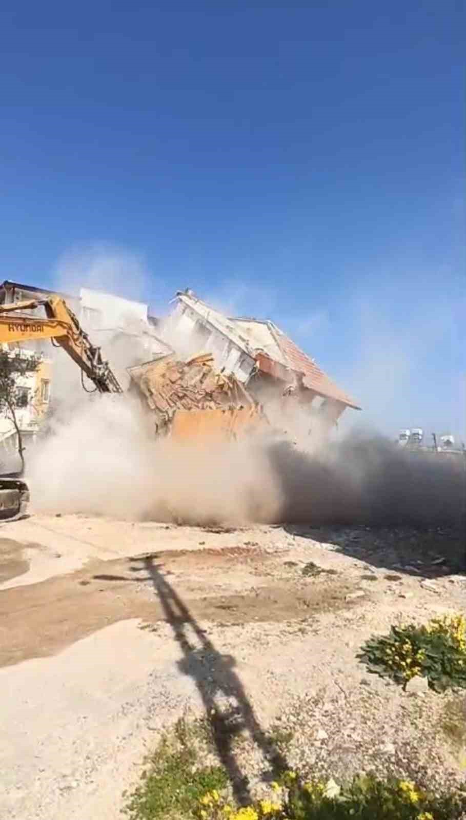 Kahramanmaraş merkezli depremlerde ağır hasar alan Hatay’da mahkeme süreci sona eren binaların yıkım ve enkaz kaldırma çalışmaları aralıksız sürüyor. Antakya ilçesi Esentepe Mahallesi’nde bulunan 4 katlı bina, iş makinesiyle kontrollü olarak yıkıldı. Binanın yıkılma anı ise kameralara yansıdı. 4 katlı binanın yıkımı esnasında herhangi bir olumsuzluk yaşanmadı.