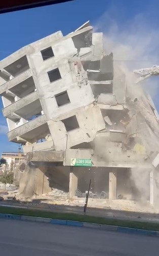 Hatay’ın Kırıkhan ilçesinde depremde hasar alan 6 katlı bina, iş makinesinin tek dokunuşuyla yerle bir oldu.