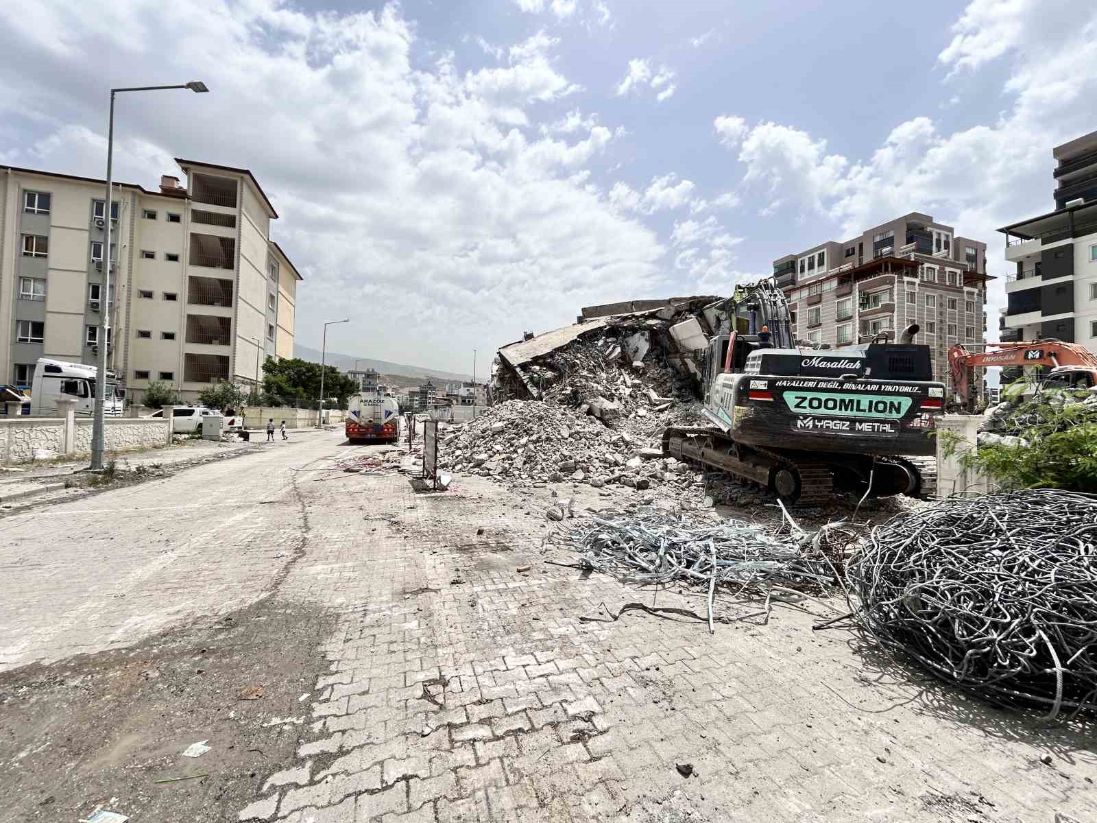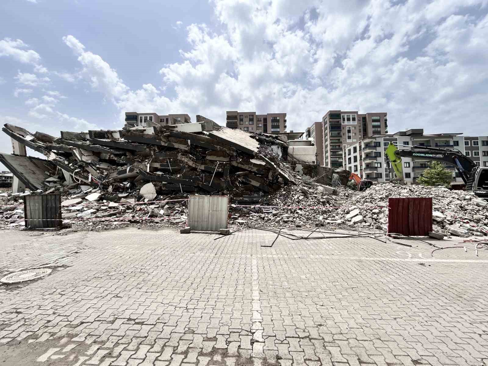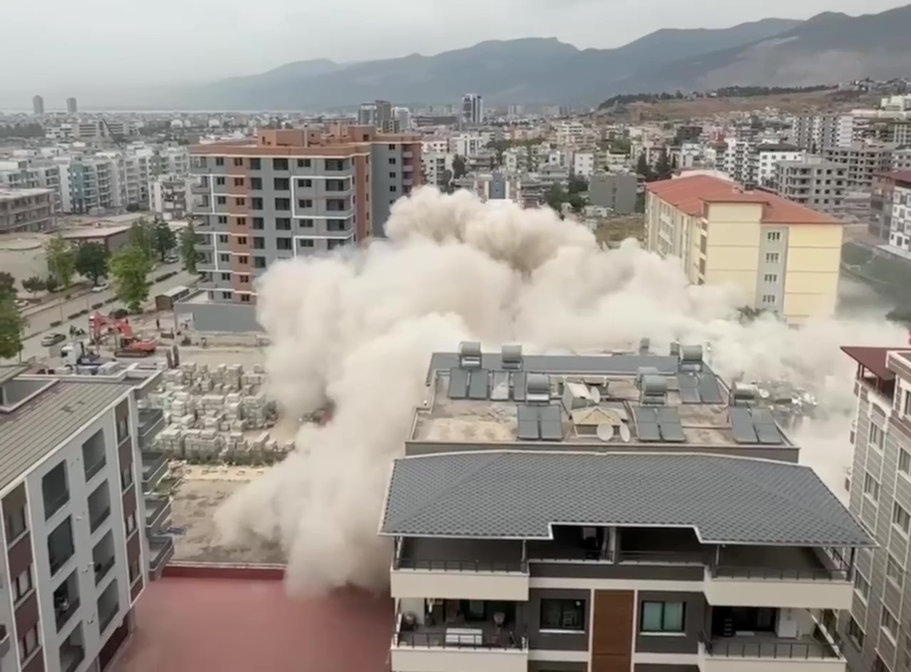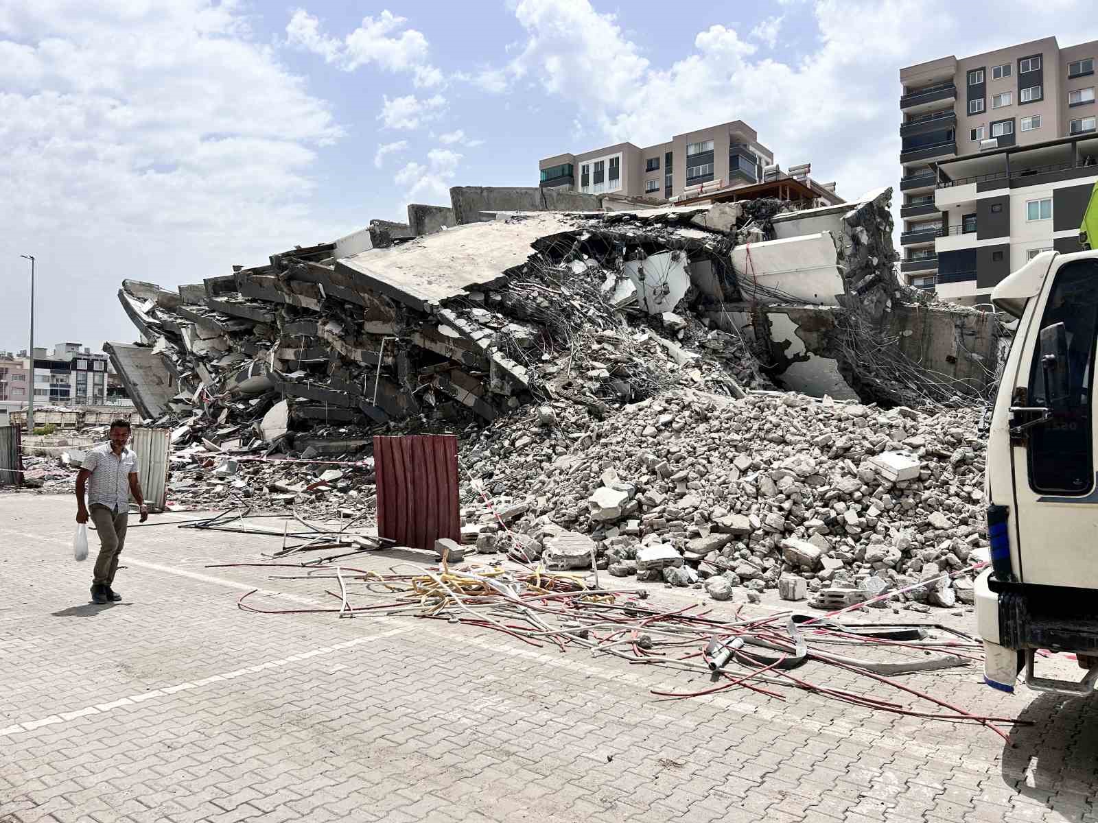 Kahramanmaraş merkezli depremlerde ağır hasar alan Hatay’da mahkeme süreci sona eren binaların yıkım ve enkaz kaldırma çalışmaları aralıksız sürüyor. Bu kapsamda İskenderun ilçesi Mustafa Kemal Mahallesi’ndeki 7 katlı bina, iş makinesi ile kontrollü olarak yıkıldı. Binanın yıkılma anı ise kameralara anbean yansıdı. Kağıt gibi yerle bir olan 7 katlı binanın yıkımı esnasında herhangi bir olumsuzluk yaşanmadı.