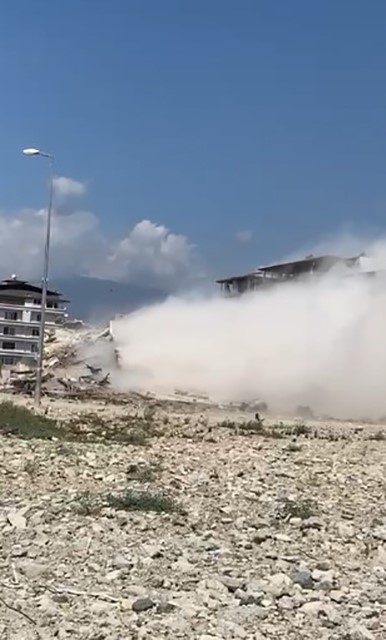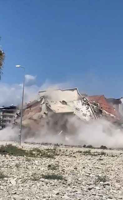 Kahramanmaraş merkezli depremlerde ağır hasar alan Hatay’da mahkeme süreci sona eren binaların yıkım ve enkaz kaldırma çalışmaları aralıksız sürüyor. Defne ilçesi Çekmece Mahallesi’nde bulunan 7 katlı bina, iş makinesi ile kontrollü olarak yıkıldı. Binanın yıkılma anı ise kameralara an be an yansıdı. 7 katlı binanın yıkımı esnasında herhangi bir olumsuzluk yaşanmadı.