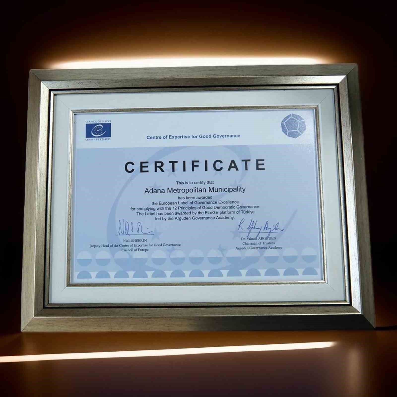 • Adana Büyükşehir Belediyesi, Avrupa Yönetişim Mükemmelliği Markası Ödülü’ne layık görüldü.