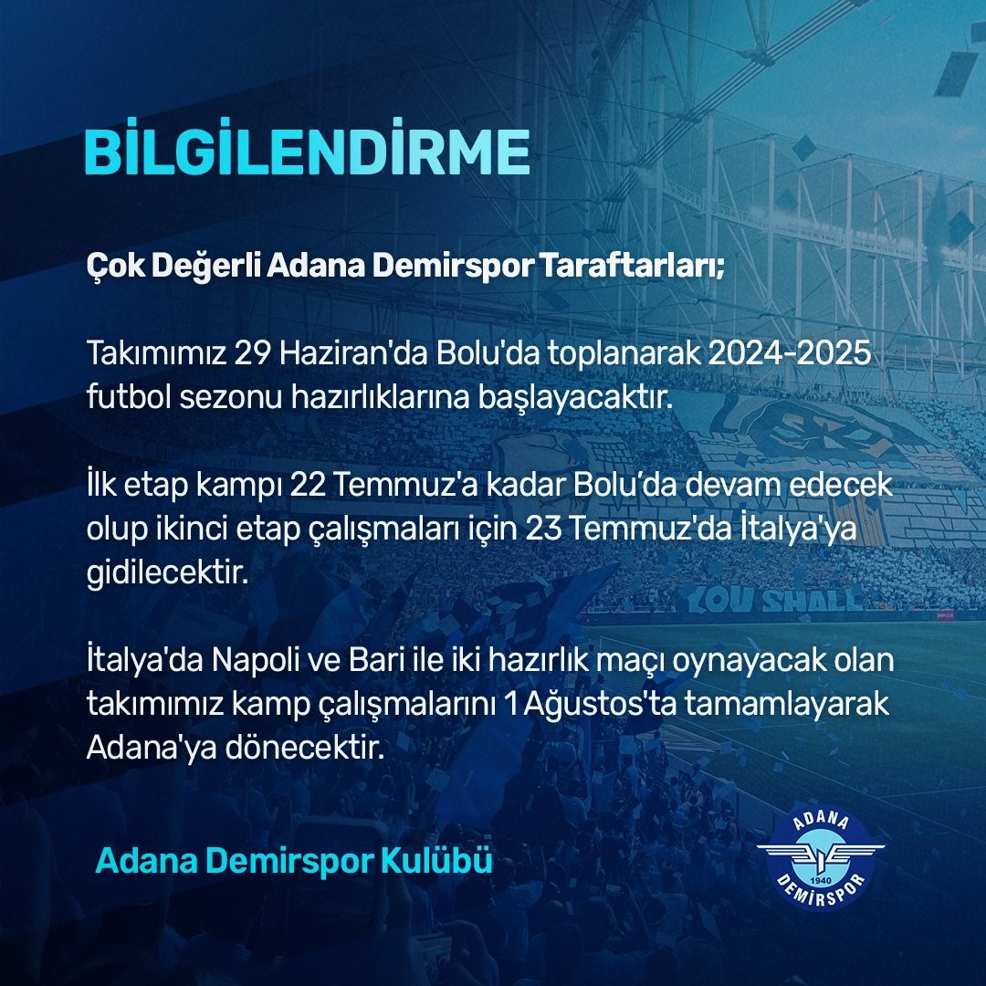 Süper Lig’de geçen sezonu 44 puanla on ikinci sırada tamamlayan mavi-lacivertli ekipte 2024-2025 sezonu hazırlıkları, dün yardımcı antrenör Nedim Askeri’nin yönetimindeki ilk idmanla Bolu’da başladı. Adana Demirspor, 22 Temmuz’a kadar Bolu kampına devam edecek ve sezon hazırlıklarının ikinci etabına 23 Temmuz’da İtalya’da devam edecek. Sezon öncesi hazırlıkları çerçevesinde Napoli ve Bari ile hazırlık maçı yapacak olan güney temsilcisi, kamp çalışmalarını 1 Ağustos’ta tamamlayıp Adana’ya dönecek.