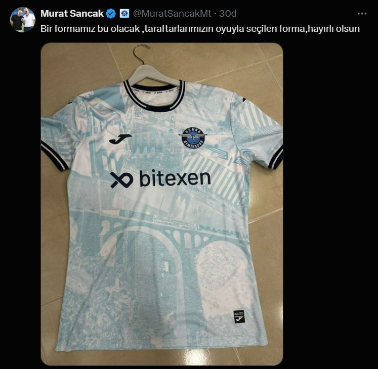 Adana Demirspor Başkanı Murat Sancak, Adana Demirspor’un 2024-2025 sezonunda giyeceği formalardan birini sosyal medya hesabı üzerinden paylaştı. Formanın taraftarların oyuyla seçildiğini belirten Sancak, paylaşımında “Bir formamız bu olacak, taraftarlarımızın oyuyla seçilen forma, hayırlı olsun” ifadelerine yer verdi.