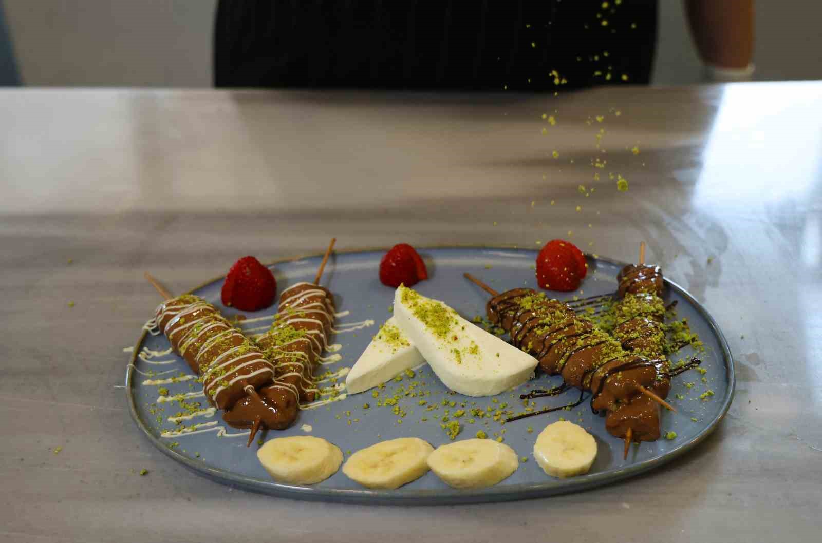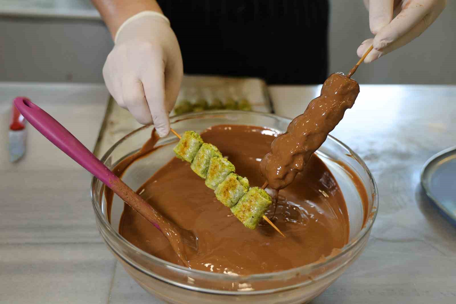 Adanalı tatlıcının geleneksel katmeri çeşitlendirmek için yaptığı Adana usulü ’çöp şiş katmer’ adeta yok satıyor.