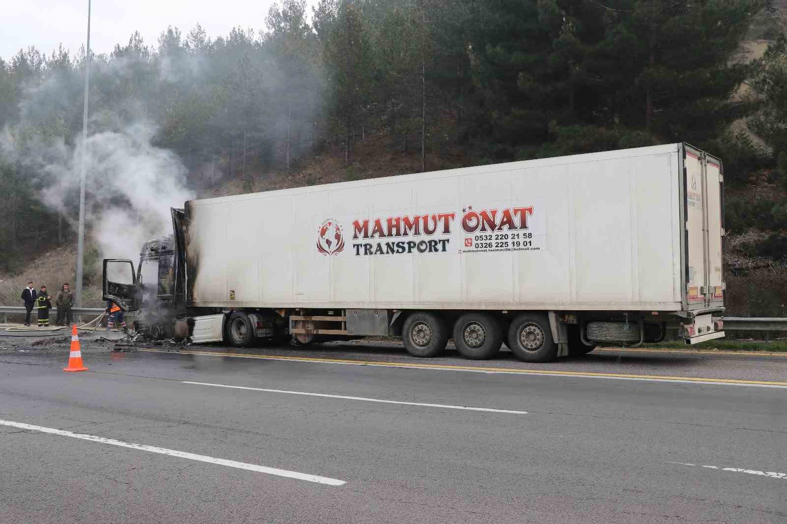 Adana – Pozantı otoyolunda seyir halindeki mandalina yüklü Mercedes Axor marka tırda yangın çıktı. Alevler aracın kupa kısmını tamamen sardı. Tır, kullanılamaz hale geldi.