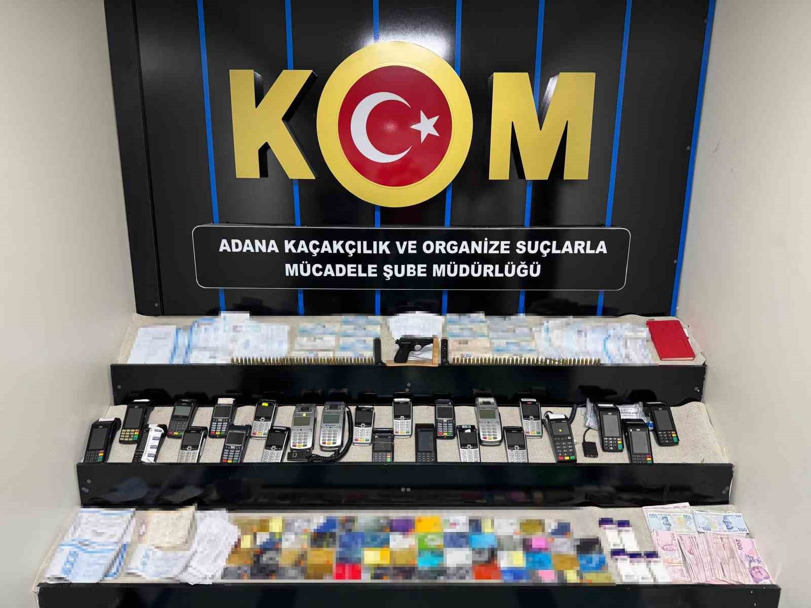 Polisin yaptığı aramalarda ise 26 adet pos cihazı, 205 adet slip, 129 kredi kartı, 16 milyon 676 bin 700 TL değerinde 221 adet senet, 28 adet çek, 3 tapu senedi, 45 bin TL para, 15 adet ajanda, ruhsatsız tabanca, 243 adet uyuşturucu hap, bin adet gümrük kaçağı puro ve 205 adet elektronik sigara kiti ele geçirildi.