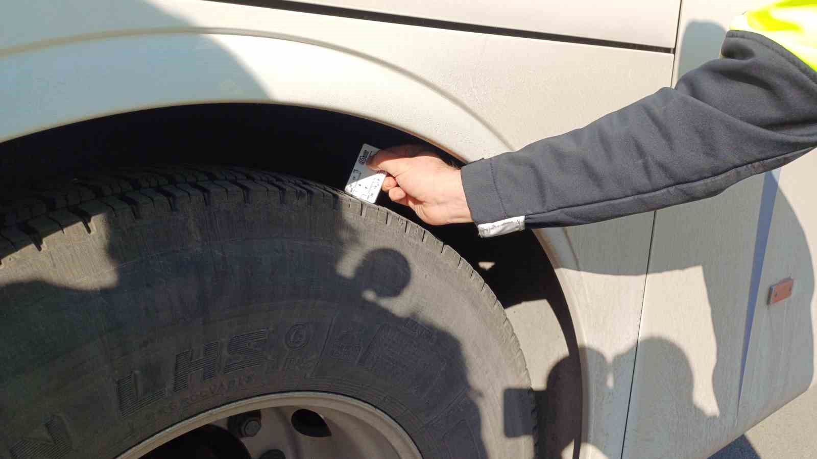 Yolcu otobüslerinde kış lastiklerinin bulunup bulunmadığını denetleyen ekipler, takılı lastiklerin de diş derinliklerini kontrol etti.