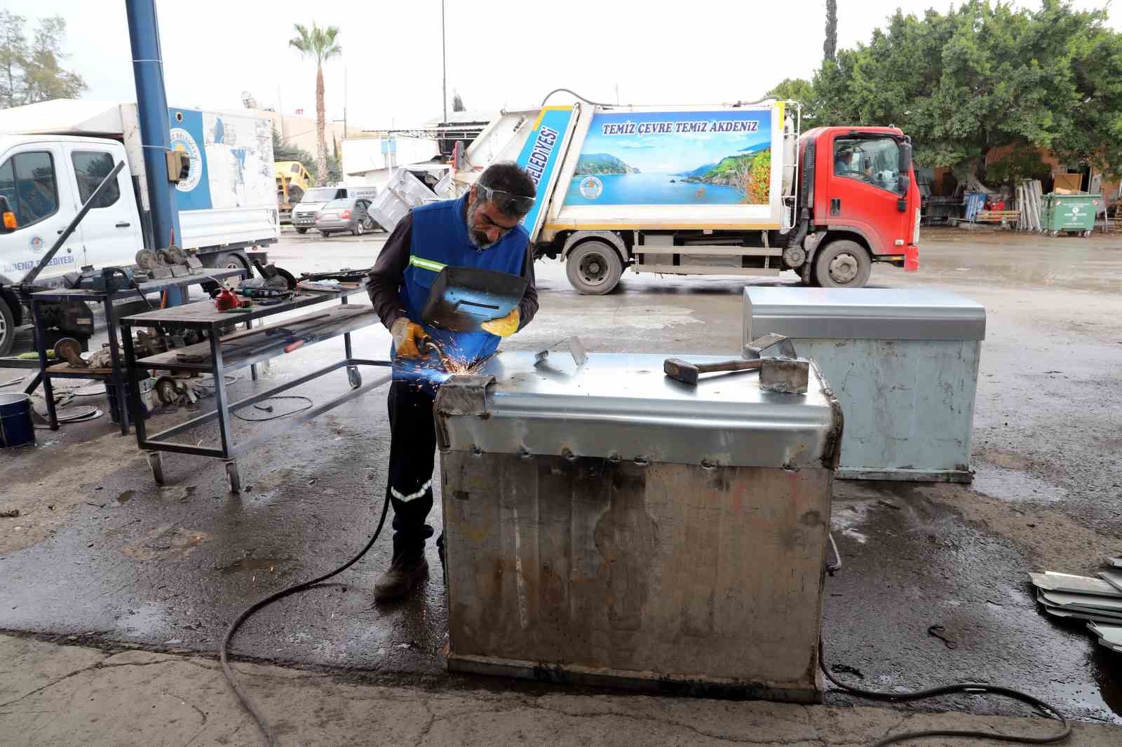 Akdeniz Belediyesi hem üreterek hem de yenileyerek tasarruf sağlıyor. Fen İşleri Müdürlüğüne bağlı ekipler, belediye envanterinde bulunan hizmet araç ve gereçlerini tamir ederken, zaman içinde yıpranıp zarar gören çöp konteynerleri de makine ikmal sahasında yenileniyor.