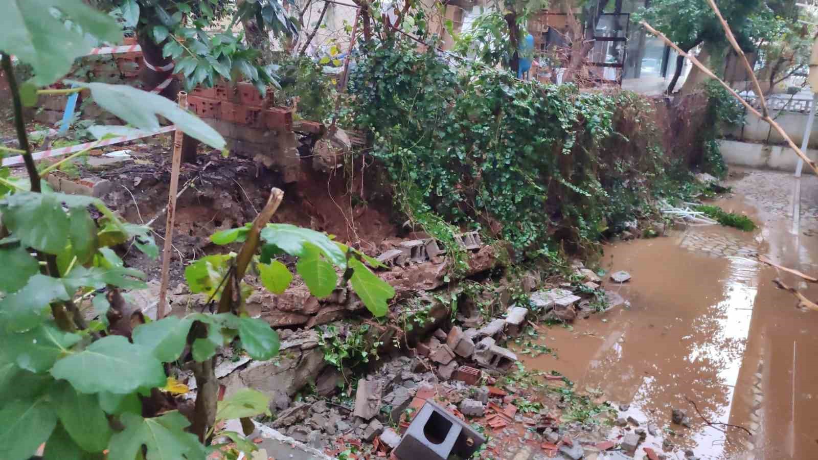 Alanya’da gece boyunca etkili olan yağış ve fırtına, Güller Pınarı Mahallesi 306. Sokak’ta bulunan bir binanın istinat duvarının çökmesine neden oldu. Bahçe içerisinde bulunan 2 motosiklet, duvarın çökmesi sonucu zarar gördü.