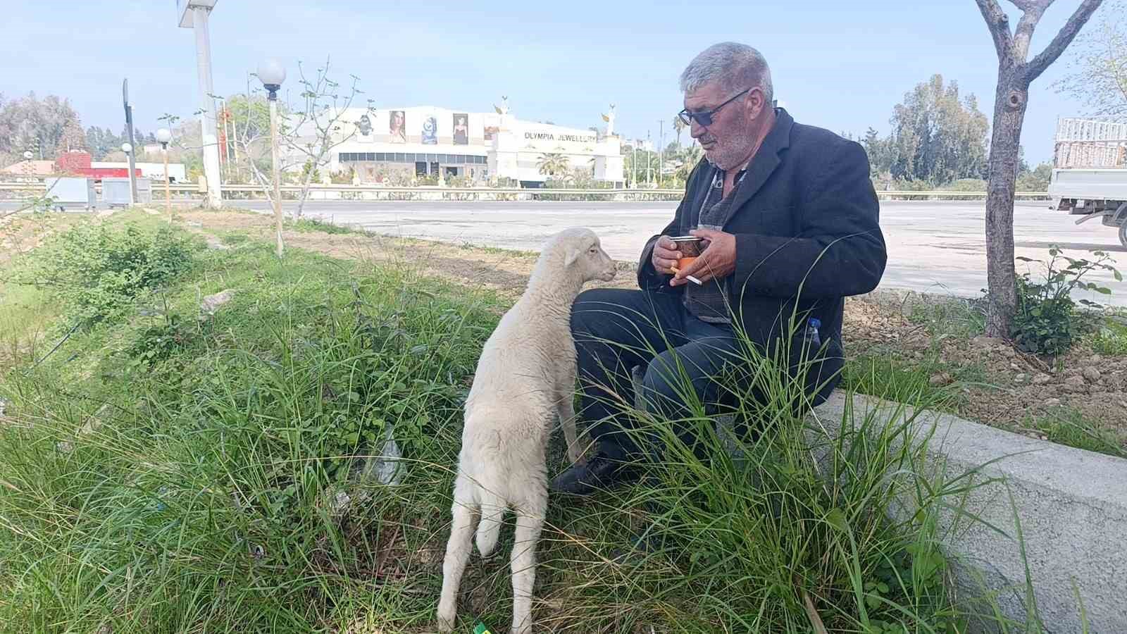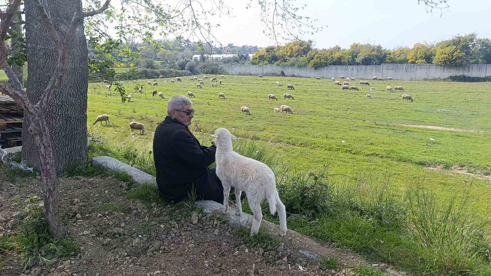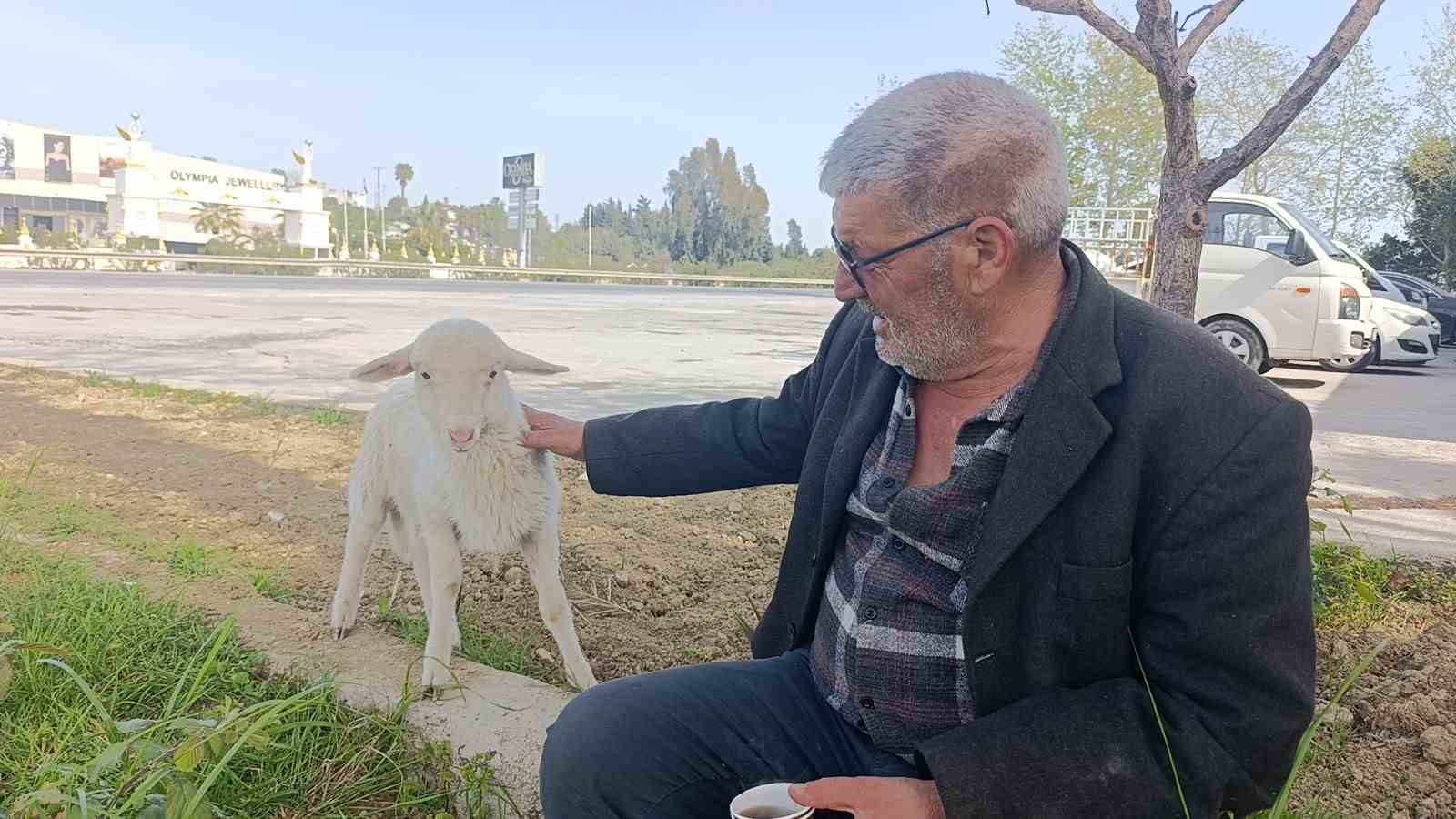 Koyunlarını Manavgat-Alanya D-400 kara yolu kıyısında bulunan boş arazilerde otlatan Hasan Kiraz’ı, yavru kuzu yol kenarında bulunan lokantaya su almaya giderken gölge gibi izliyor. Peşinden bir an olsun ayrılmayan sevimli kuzunun kendisinin koruması olduğunu söyleyen Kiraz, “Annesi 3 yavru birden doğurdu. 2 yavruyu annesi emzirirken, korumayı ben biberonla besledim. Bu süreçte yanımdan bir an bile ayrılmaz oldu. Ben nereye, koruma oraya” dedi.