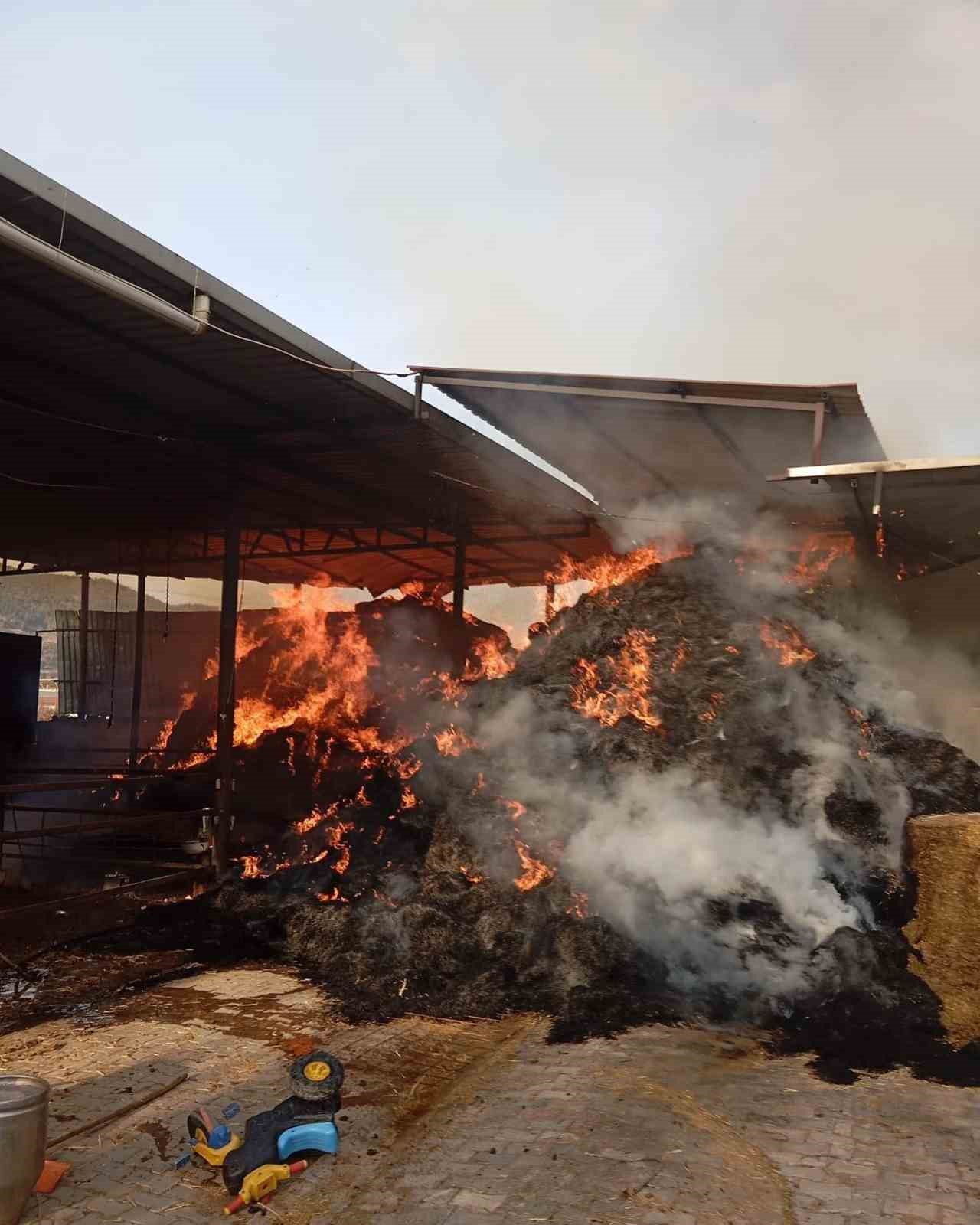 Hatay’da ahırın samanlık kısmında yaşanan yangında saman balyaları alev alev yanarak zarar gördü.
