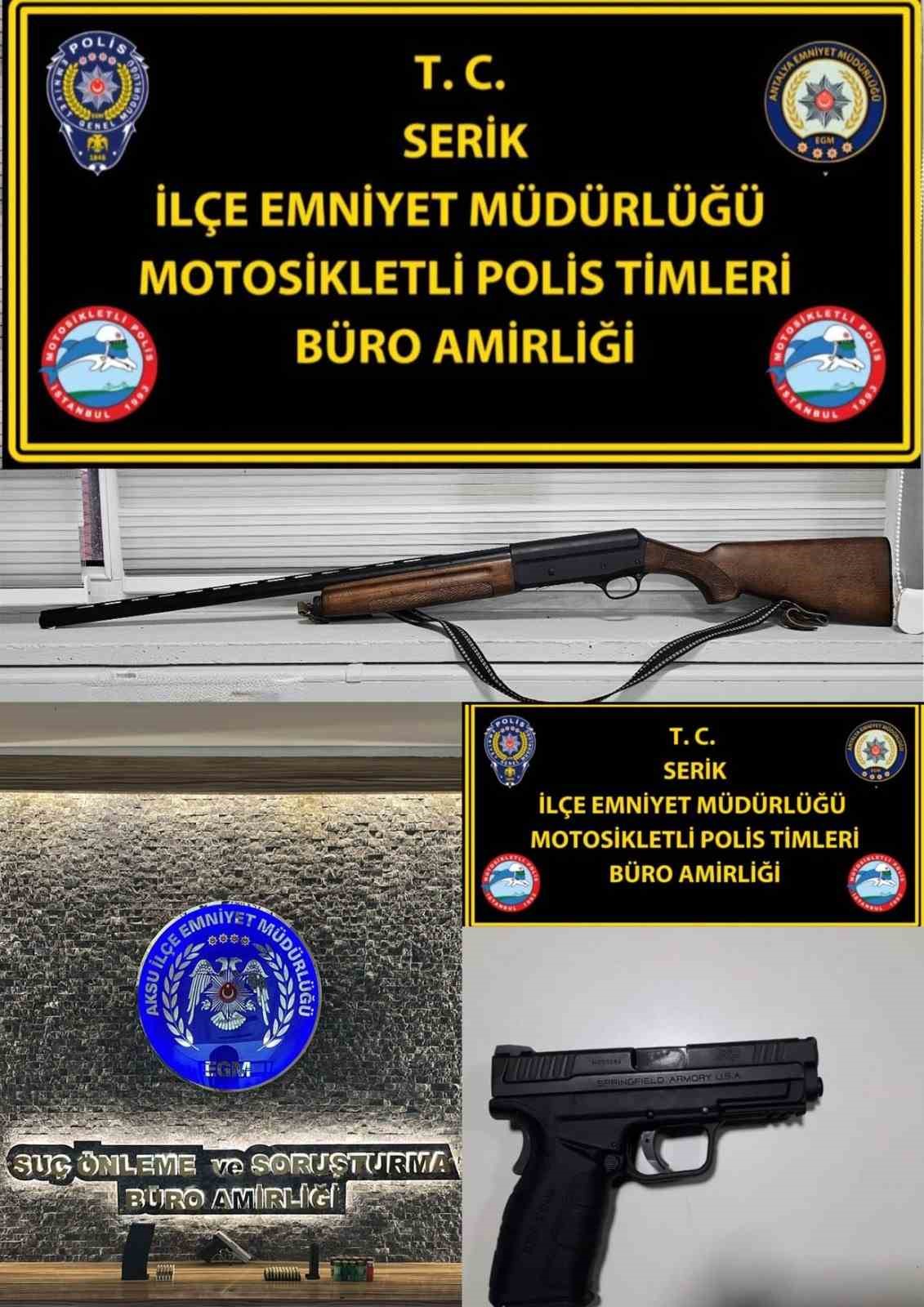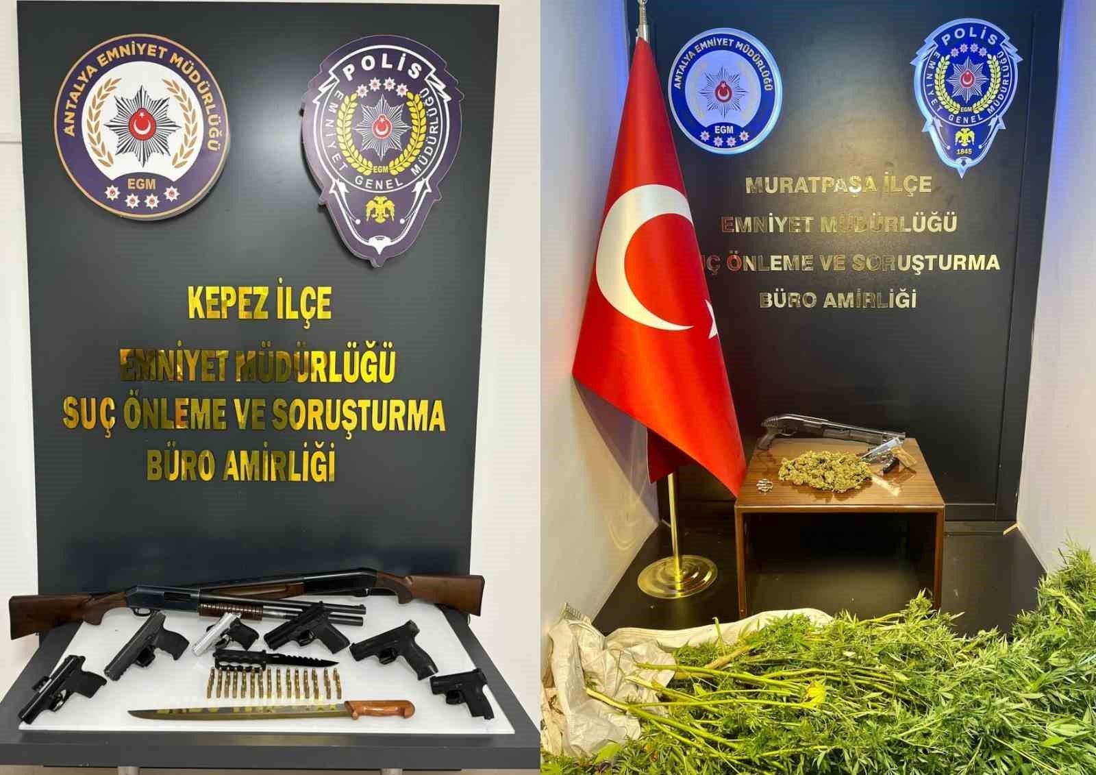 Antalya Asayiş Şube Müdürlüğü koordinesinde İlçe Emniyet Müdürlükleri tarafından yapılan suçun önlenmesine yönelik çalışmalarda, Kepez ilçesinde 27, Muratpaşa ilçesinde 8, Aksu ilçesinde 3 ve Serik ilçesinde 1 olmak üzere toplam 39 şahıs yakalanarak haklarında adli işlem başlatıldı. Eş zamanlı olarak gerçekleştirilen aramalarda; 7 ruhsatsız tabanca, 5 ruhsatsız tüfek, 2 kuru sıkı tabanca, 157 fişek, 40 kartuş, 2 bıçak, 22 kök kenevir ve 350 gram uyuşturucu ele geçirildi.