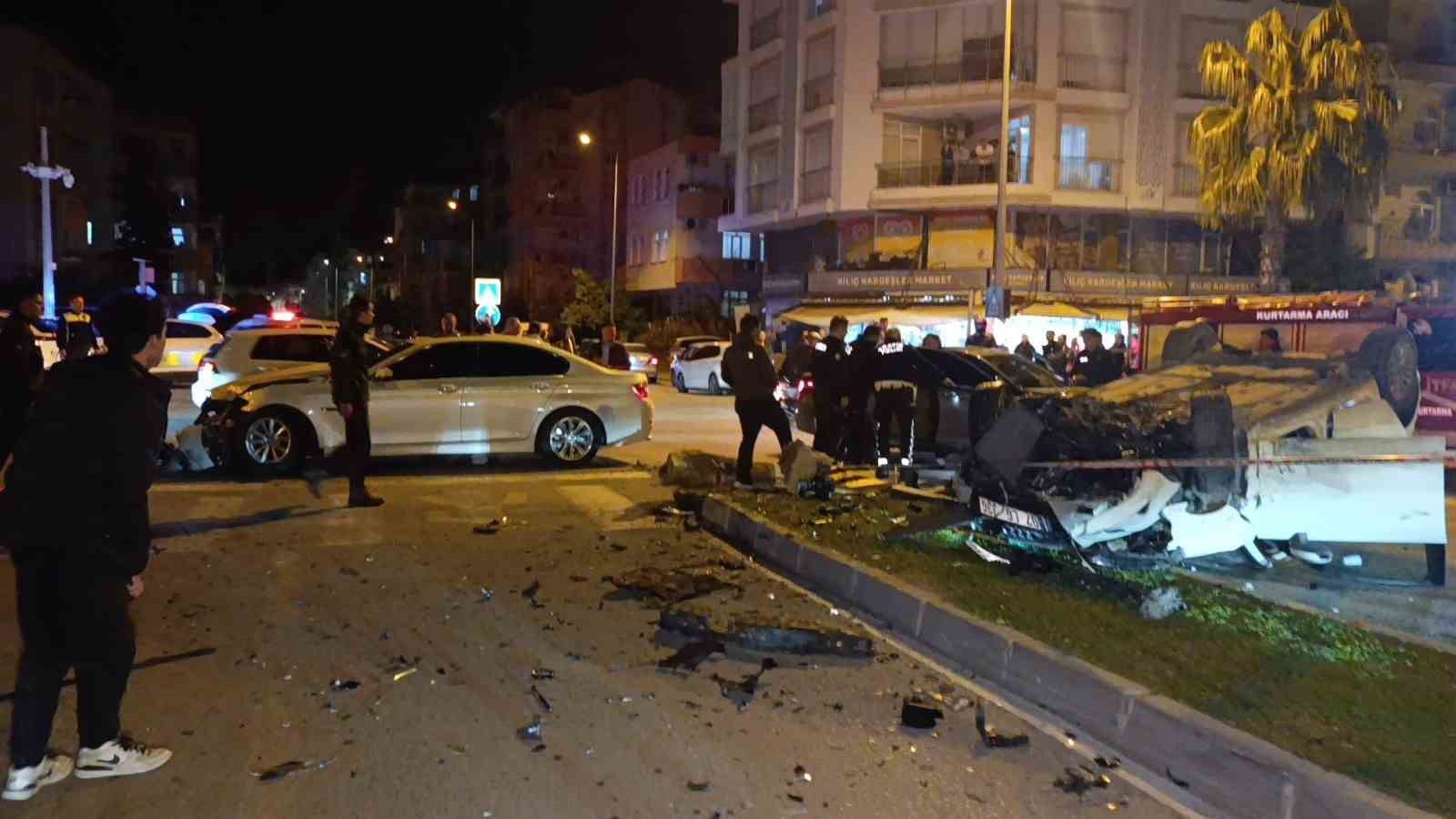 Antalya’da tali yoldan aşırı hızlı şekilde çıkan otomobil seyir halindeki başka bir araca çarparak takla attı. Otomobile çarptıktan sonra refüj ve tabelayı parçalayarak takla atan ve ehliyeti bulunmayan otomobil sürücüsü olay yerini terk ederken, kazada 4 kişi yaralandı.