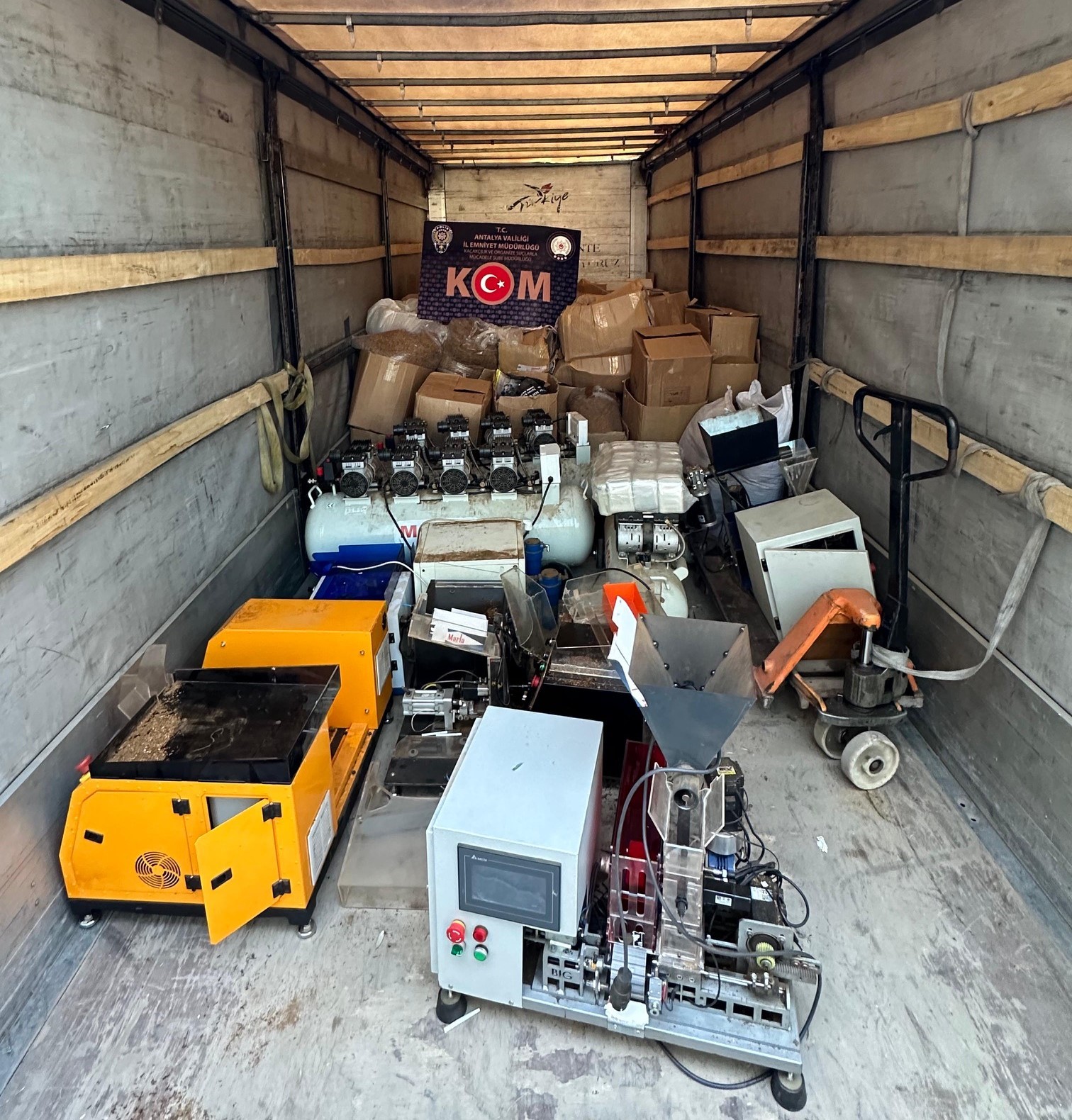 Edinilen bilgiye göre, Antalya Cumhuriyet Başsavcılığı koordinesinde, Emniyet Müdürlüğü birimlerince gerçekleştirilen “5607 Sayılı Kaçakçılık Kanunu’na Muhalefet” faaliyetlerine yönelik yapılan çalışmalarda; Aksu ilçesinde bir adrese operasyon düzenlendi. Yapılan işlem neticesinde; 857 bin 600 adet boş makaron, 845 paket gümrük kaçağı sigara, 715 kilogram kıyılmış tütün, 6 adet sigara sarma makinesi, 4 adet kompresör ve 1 adet tütün nem alma makinası ele geçirildi. Operasyon kapsamında, 2 şahsa “5607 sayılı Kaçakçılık Kanunu’na muhalefet etmek” suçundan adli işlem yapıldı.