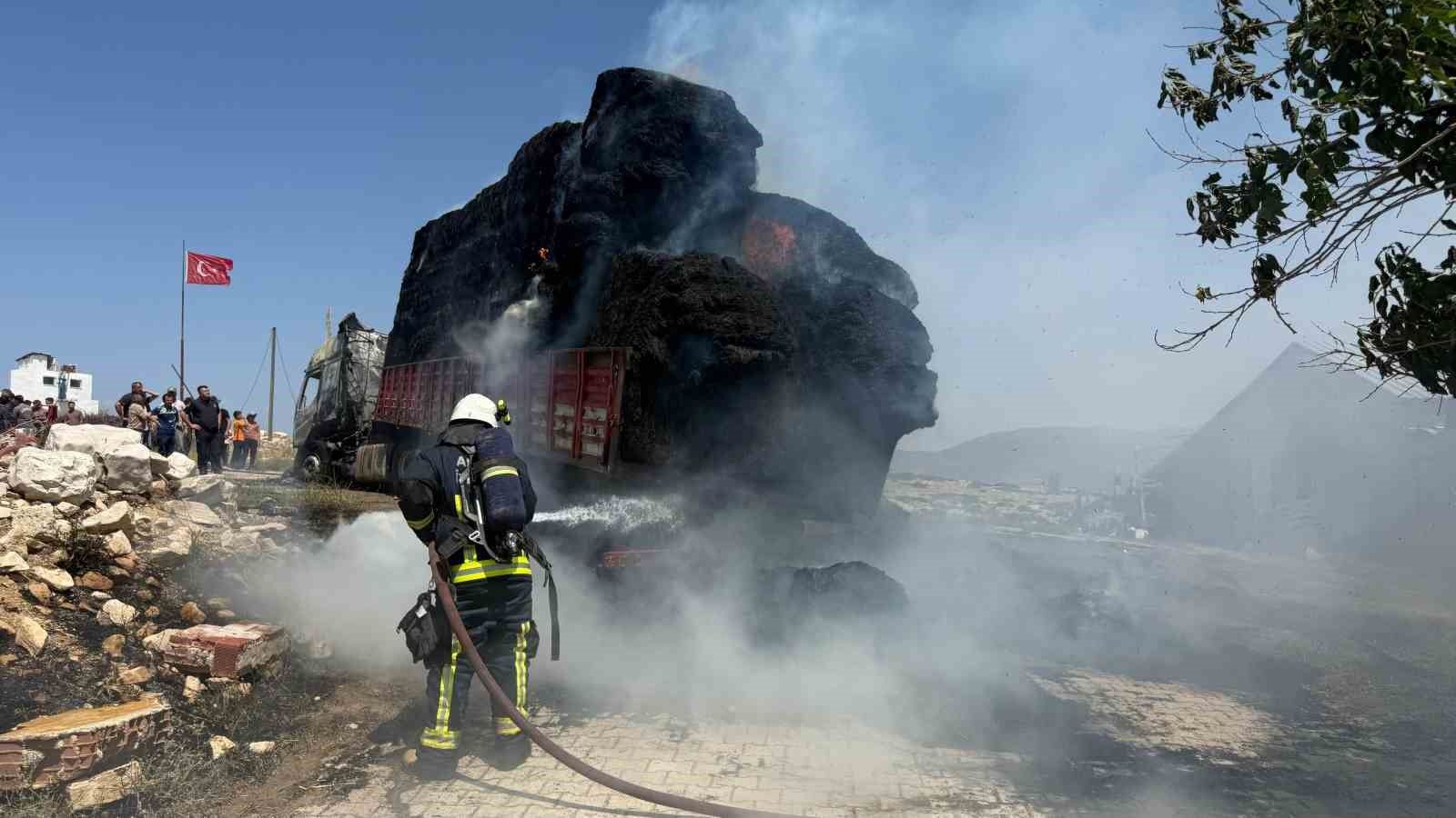Kısa sürede büyüyen alevler, tırın dorsesindeki saman balyalarını tamamen sardı. Rüzgarın da etkisiyle yangın hızla yayıldı ve araç kullanılamaz hale geldi. Mahalle sakinlerinin 112 Acil Çağrı Merkezine yaptığı ihbar üzerine olay yerine itfaiye ekipleri sevk edildi. Ekipler, yangını kontrol altına alarak uzun süre soğutma çalışması yaptı.