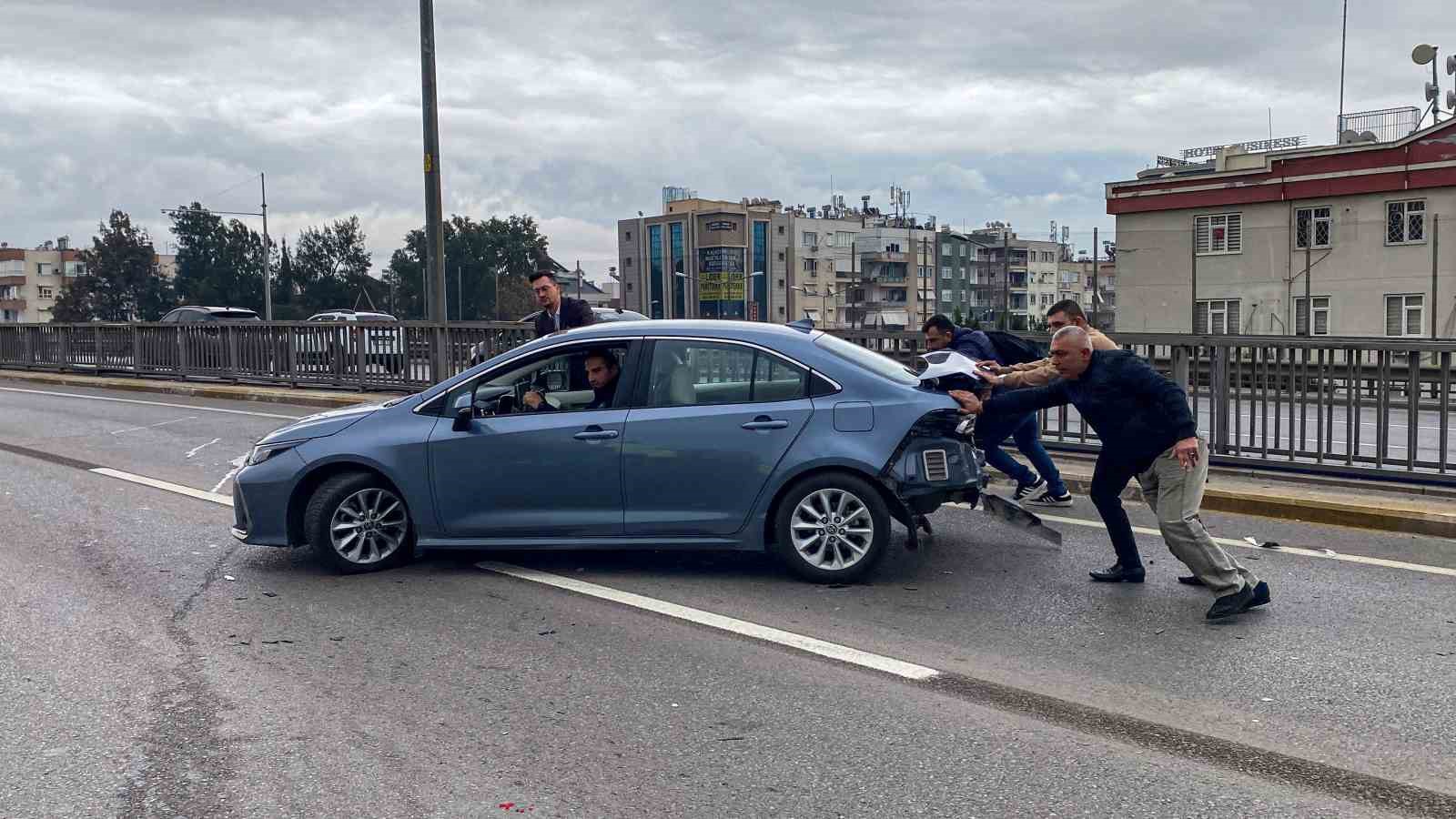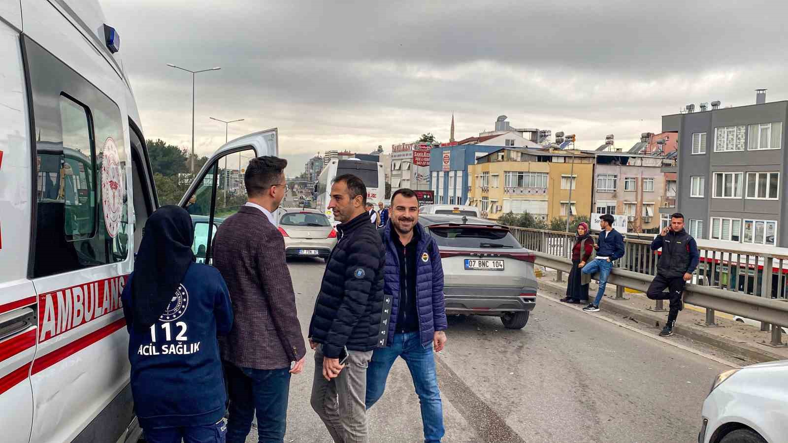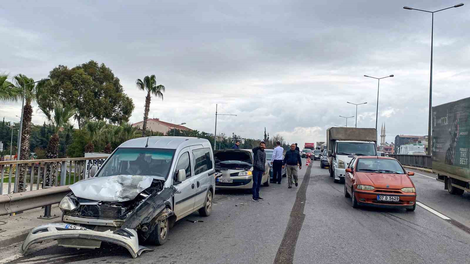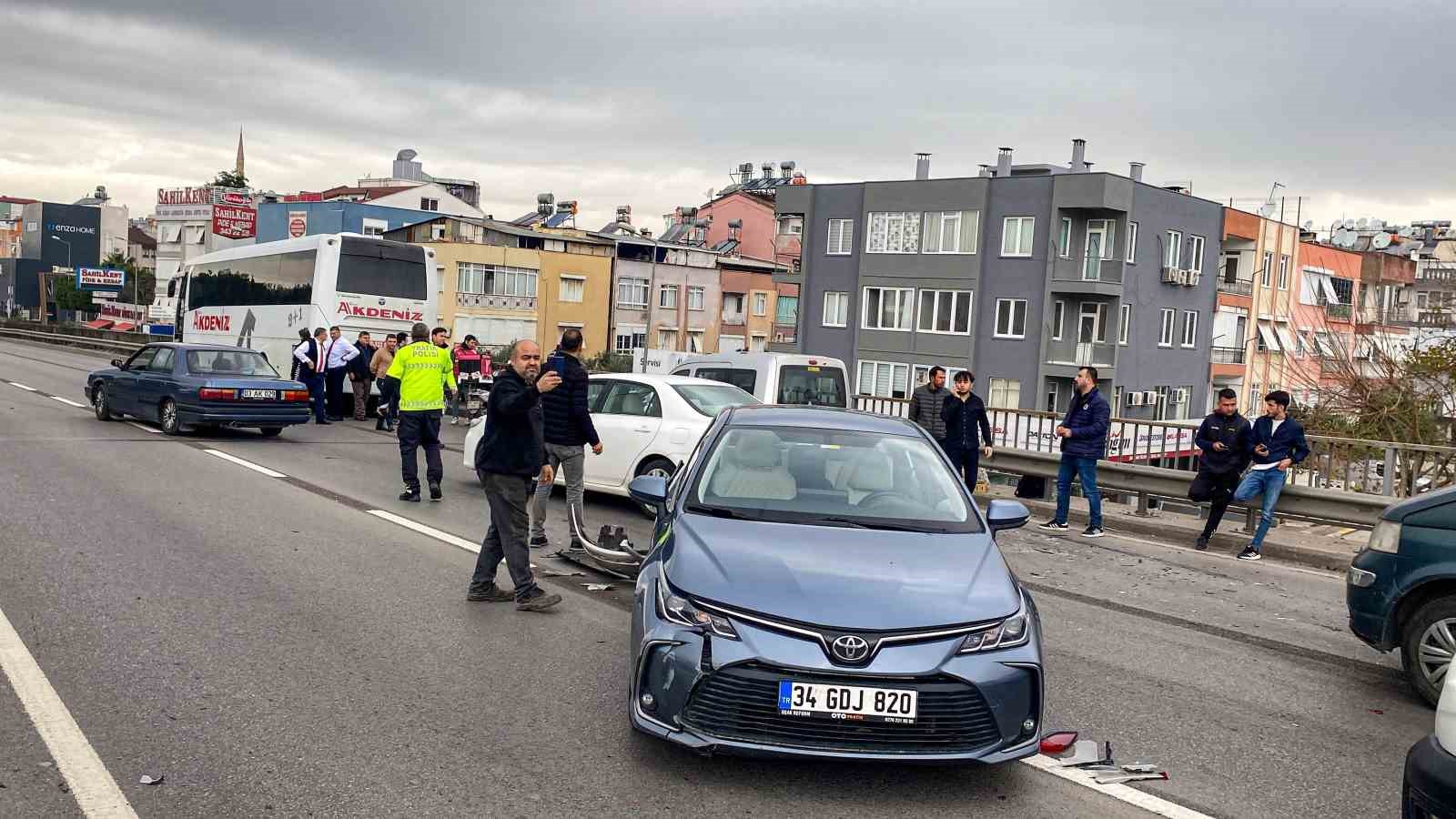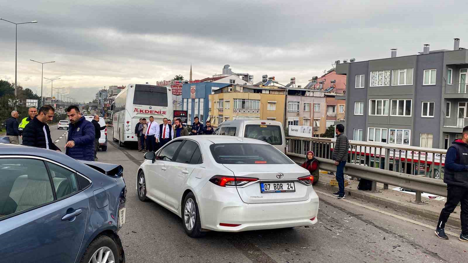 Kaza, saat 11.00 sıralarında Kepez ilçesi Yükseliş Mahallesi Gazi Bulvarı araç üstgeçidinde meydana geldi. Alınan bilgiye göre, havalimanı istikametinden şehir merkezine doğru hareket halinde bulunan Hasan Okan Çıtır kontrolündeki Toyota marka 34 GDJ 820 plakalı otomobille, Sadık Devir kontrolünde bulunan 07 BDJ 985 plakalı otomobil çarpıştı. Kazaya araçların kontrolünü kaybetmesinin ardından Mehmet Ateş idaresindeki Opel marka 45 FV 030 hafif ticari araç ile Alanya’dan Antalya otogarına gitmekte olan Muammer Mutlu idaresindeki 07 ZG 229 plakalı Temsa marka şehirlerarası otobüs de karıştı. Kazada bir hafif ticari araç adeta kullanılamaz hale geldi. Bir başka otomobil ise yan durdu.