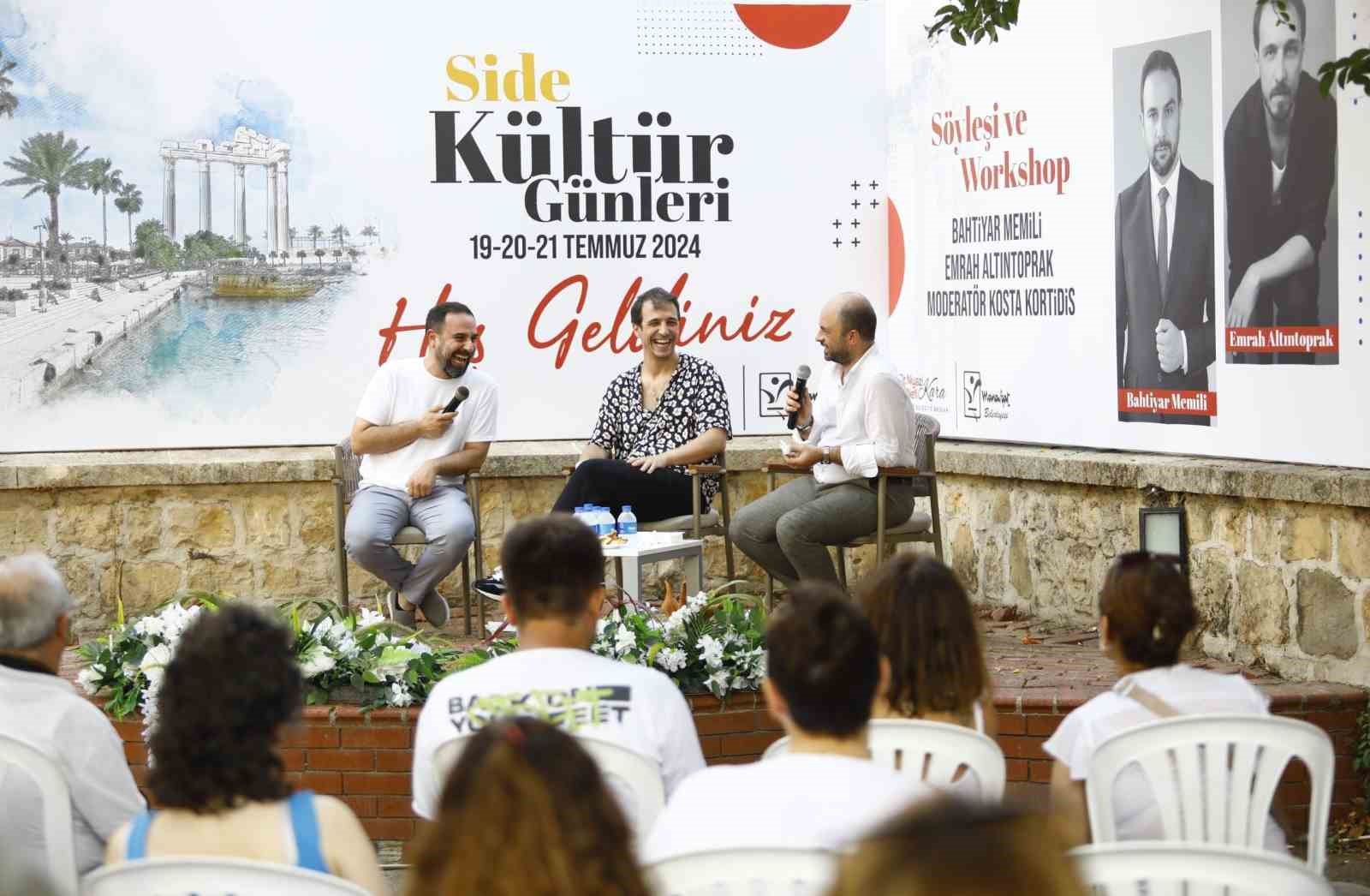 Side Kültür Günleri’nin açılışı, sanatseverlerin, müzik tutkunlarının ve kültür meraklılarının bir araya gelip Side’nin tarihî atmosferinde unutulmaz bir gün geçirmelerini sağladı. Side Kültür Günleri, 20 Temmuz’da Bahtiyar Memili ve Emrah Altıntoprak söyleşisi ve Ritaband, Grup Nova, Derinsu Hazal Kaya, Lamajör Konserleri ile 21 Temmuz’da Akdeniz Vokal konseriyle devam edecek.