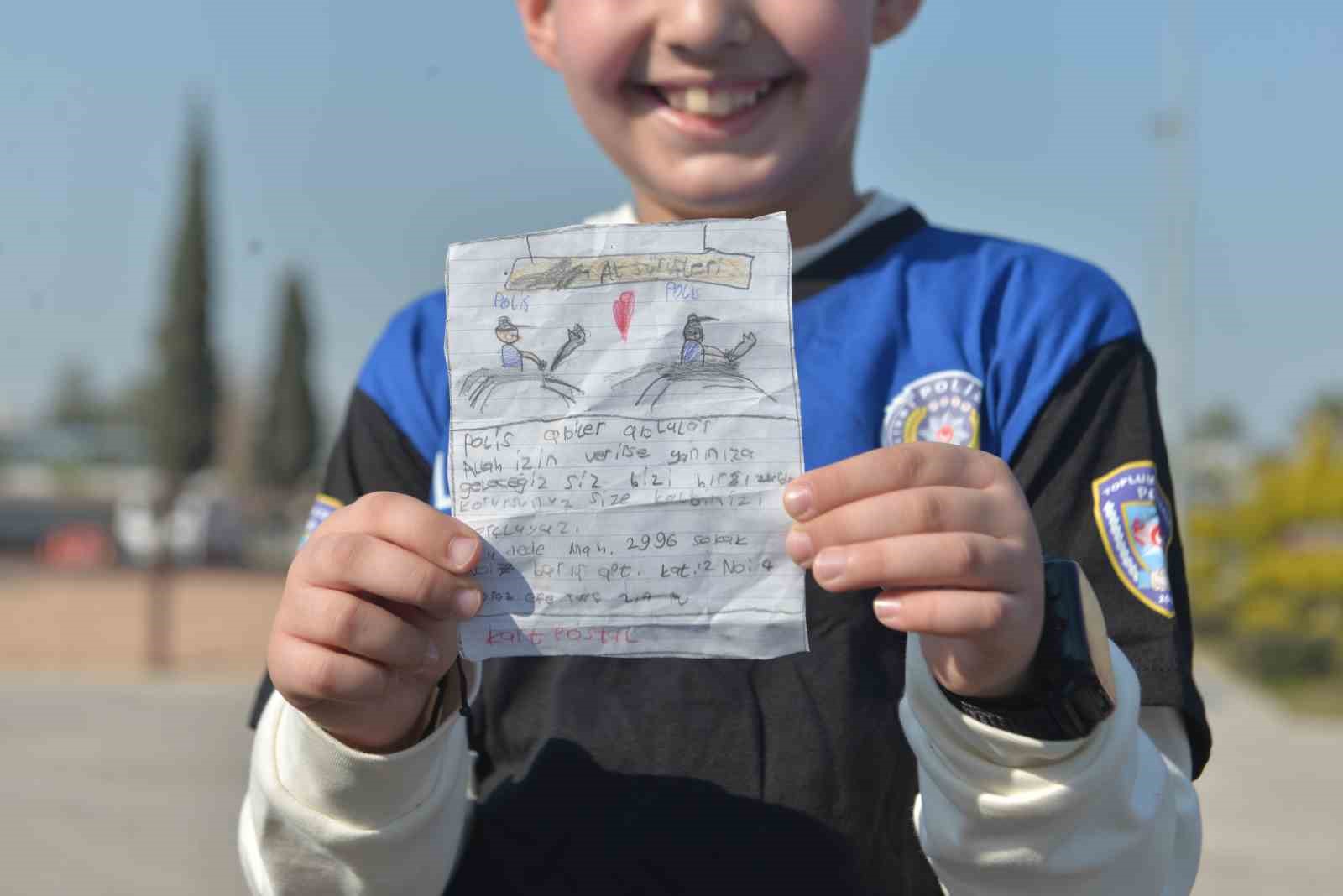 İlkokul ikinci sınıf öğrencisi Poyraz Efe Tuaç, Sarıçam ilçesine bağlı Çarkıpare Mahallesi’ndeki Şehit Ertan Tokuş İlkokulunda öğretim hayatına sürdürüyor. Poyraz Efe, okulda hayalini kurduğu atlı polislerin resmini çizdi. Çizdiği resmin altına ise Poyraz Efe, “Polis ağabeylerim ve ablalarım, Allah izin verirse yanınıza geleceğiz. Siz, bizi hırsızlardan korursunuz. Size kalbimizi borçluyuz” notunu yazdı.