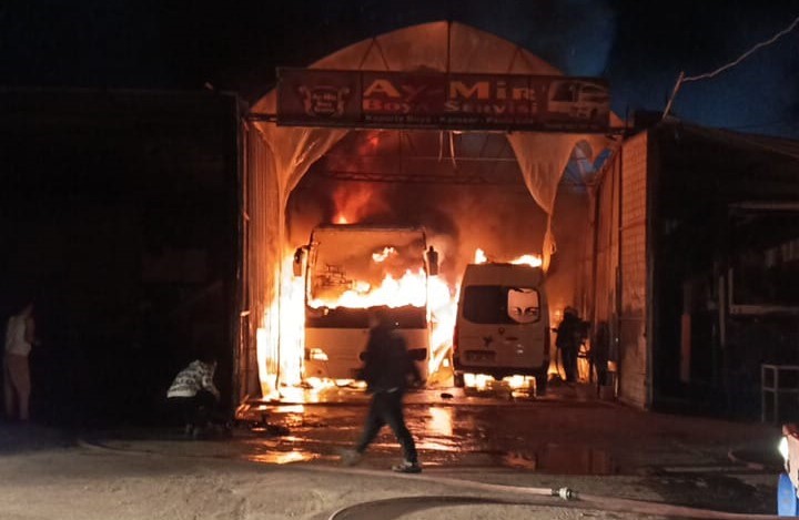 Güzelyurt Mahallesi Şehit Komando Er Mustafa Göktürk Caddesi üzerindeki araç boyama atölyesinde dün akşam saat 22.00 sıralarında henüz bilinmeyen bir nedenden ötürü yangın çıktı. Çevredekilerin ihbarı üzerine olay yerine çok sayıda itfaiye, polis ve sağlık ekibi sevk edildi. Belirtilen adrese gelen ekipler, boya ve yanıcı maddelerden dolayı patlamaların meydana geldiği yangını söndürebilmek için uzun uğraşlar verdi. Yaklaşık 2 saatlik çalışma sonucu yangın söndürülürken, iş yeri ve alevlerin sıçradığı otobüs, minibüs ve bir otomobil küle döndü.