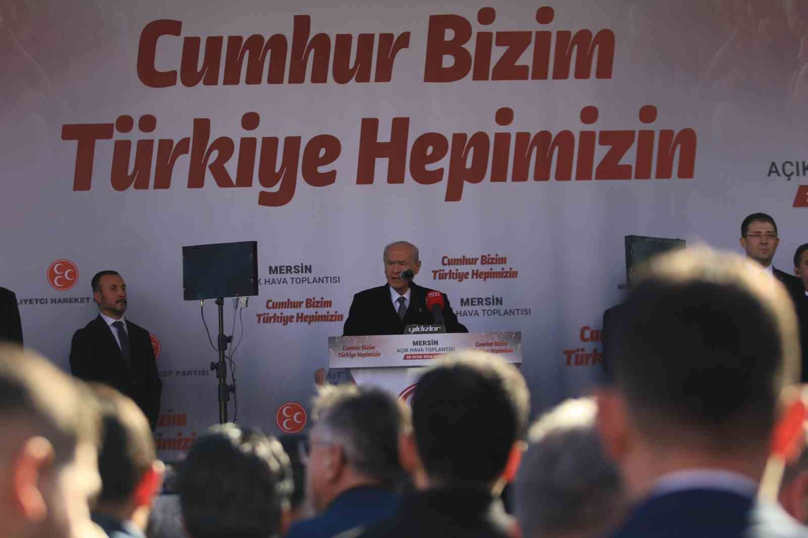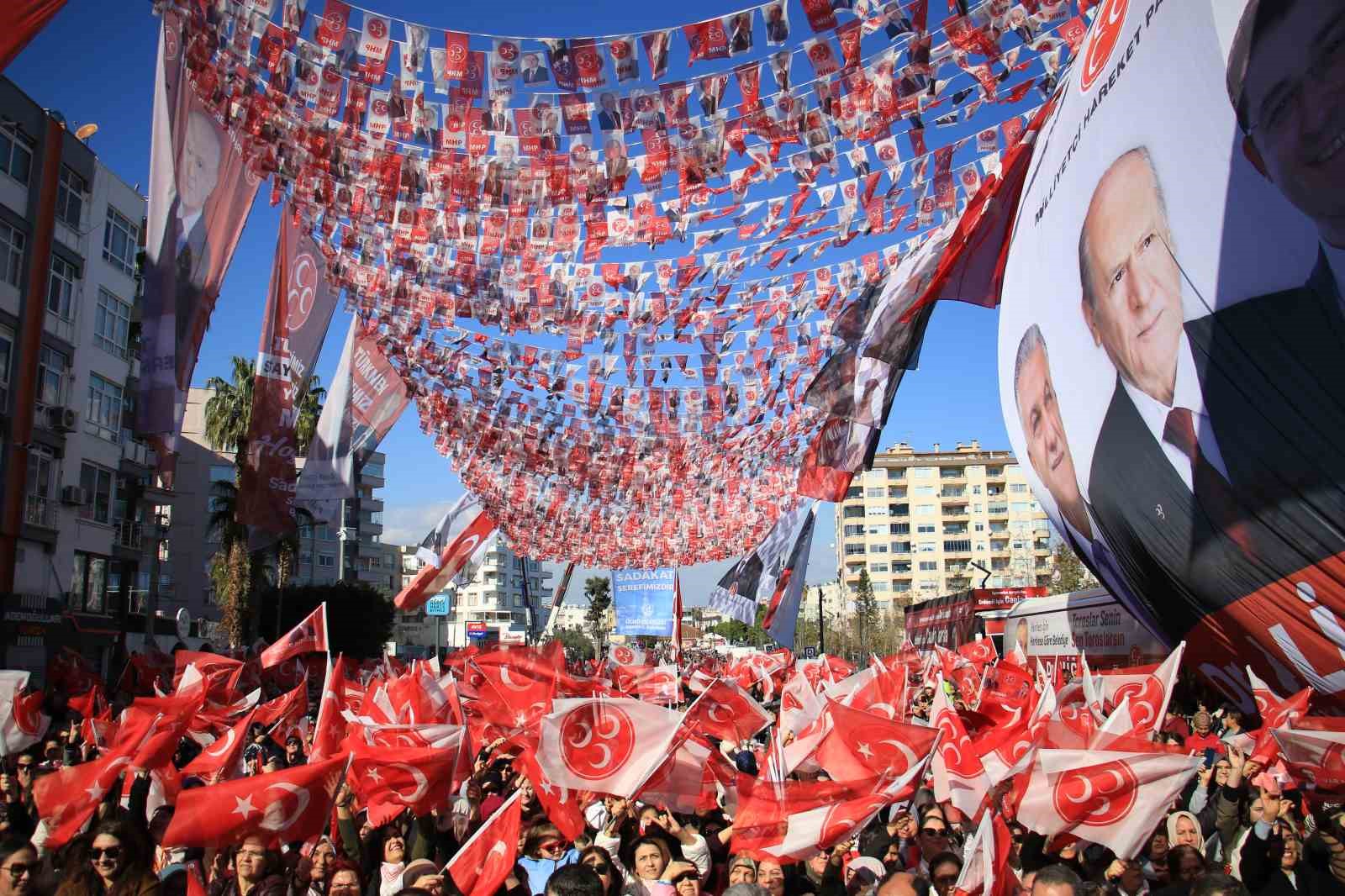 Bahçeli, mart ayındaki yerel seçimler öncesi ilk mitingini, ’Cumhur bizim Türkiye hepimizin’ temasıyla Mersin Millet Bahçesi yanındaki alanda yaptı. Konuşmasının başında Mersin’in her şeyden önce tarih, kültür ve ticaret kendi olduğunu vurgulayan Bahçeli, “Aynı zamanda Mersin kardeşliğin timsalidir. Burada ayrımcılığa yer yoktur, burada aymazlığa geçit yoktur. Mersin’de, Türkiye’mizin her yöresinin kokusu hakimdir. Ne var ki Mersin son 5 yıldır yerinde saymaktadır. Slogan milliyetçiliği, dedikodu belediyeciliği, sosyal medya belediyeciliği, ideolojik ve ilkel belediyecilik anlayışı Mersin’i yorgun düşürmüştür. Kayırmacılık, haksızlık, yolsuzluk ve hukuksuzluk Mersin’in önünü kapatmıştır. Kurulan paravan şirketler kanalıyla belediye imkanlarının nerelere ve kimlere aktarıldığını ve bölücü mihrakların nasıl şımartıldığını biliyoruz. Mersin’den Anamur’a kadar, belediye eliyle peşkeş çekilen işletme, kafe ve restoranları biliyoruz. CHP’li büyükşehir belediyesi bağlanan umutları israf etmiştir. CHP’li büyükşehir belediyesi ile hayal kırıklığı devasa boyutlara ulaşmıştır. Mersinli kardeşlerimi düşünen, dertlerine derman olan, darda ve zorda kalan insanlarımızı sahiplenen, bu kentin lehine taş üstüne taş koyan belediye yönetiminden ortada ne iz ne de eser vardır. Buna karşılık devletin kaynaklarını dağıtan, ittifak ortaklarına bedel ödeyen, devamlı şaibelerle anılan bir belediye anlayışı karşımızdadır. Geride kalan 5 yıllık hüsran döneminin telafisi lazımdır. CHP zihniyeti sınıfta kalmış, hepten çuvallamıştır. Bu nedenle yapamayan gitmeli, yapacak olan gelmelidir. Artık beceriksizlere kapıyı göstermeliyiz. Artık akıntının tersine kürek çekenlere ’uğurlar olsun’ demeliyiz. Gün doğmuş, vakit gelmiştir. Mersin için ümitler yeşermiş, huzur meşalesi yakılmıştır. Mersin bizim Türkiye hepimizindir” diye konuştu.