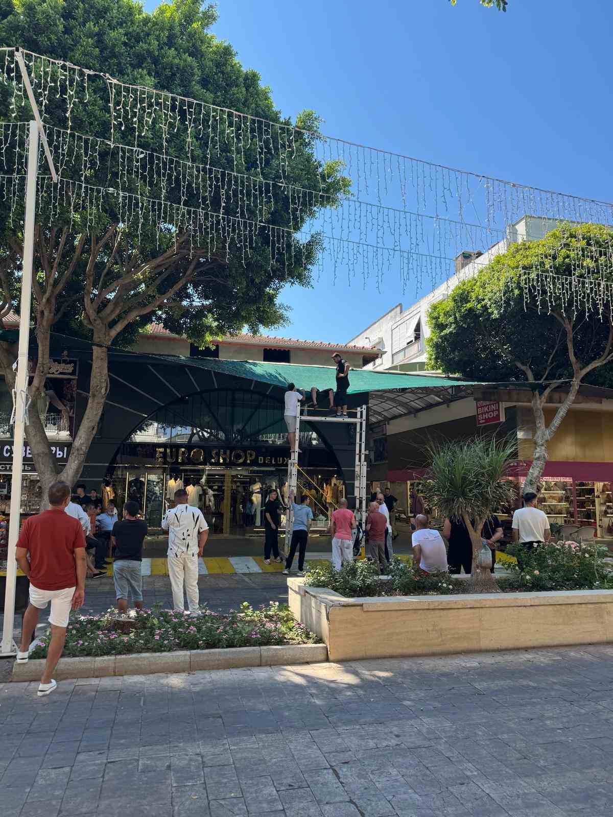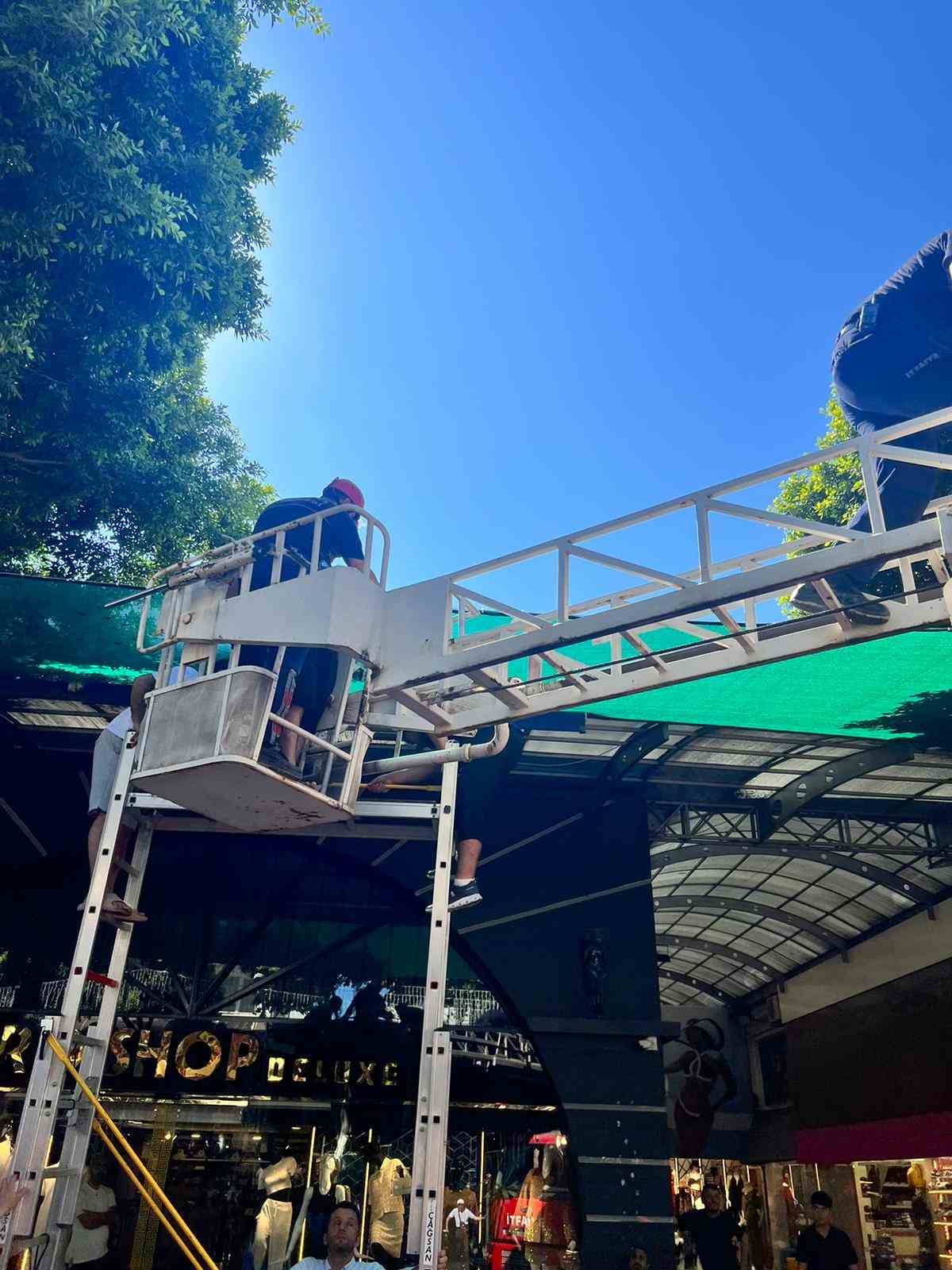 İtfaiye ekipleri olay yerine ulaşana kadar, esnaf merdiven yardımıyla tenteye çıkarak Gültepe’yi sakinleştirmeye çalıştı. Belirtilen adrese gelen itfaiye ekipleri, merdiven yardımıyla sağlık görevlilerini tenteye çıkardı. Gültepe, ekiplerin yardımıyla bulunduğu yerden indirildi.