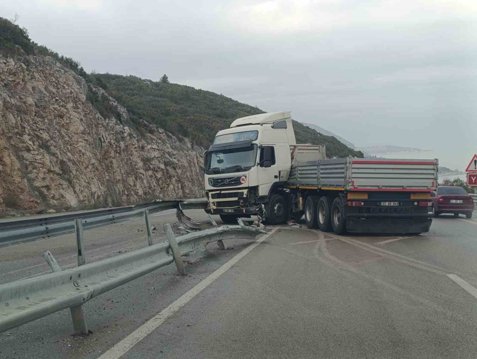 Isparta’nın Eğirdir Karayolu’nda sabah saatlerinde meydana gelen kazada, sürücüsünün kontrolünü kaybettiği tır bariyere çarptı. Çarpmanın etkisiyle makaslayan tır, trafiğin bir süre aksamasına neden oldu.