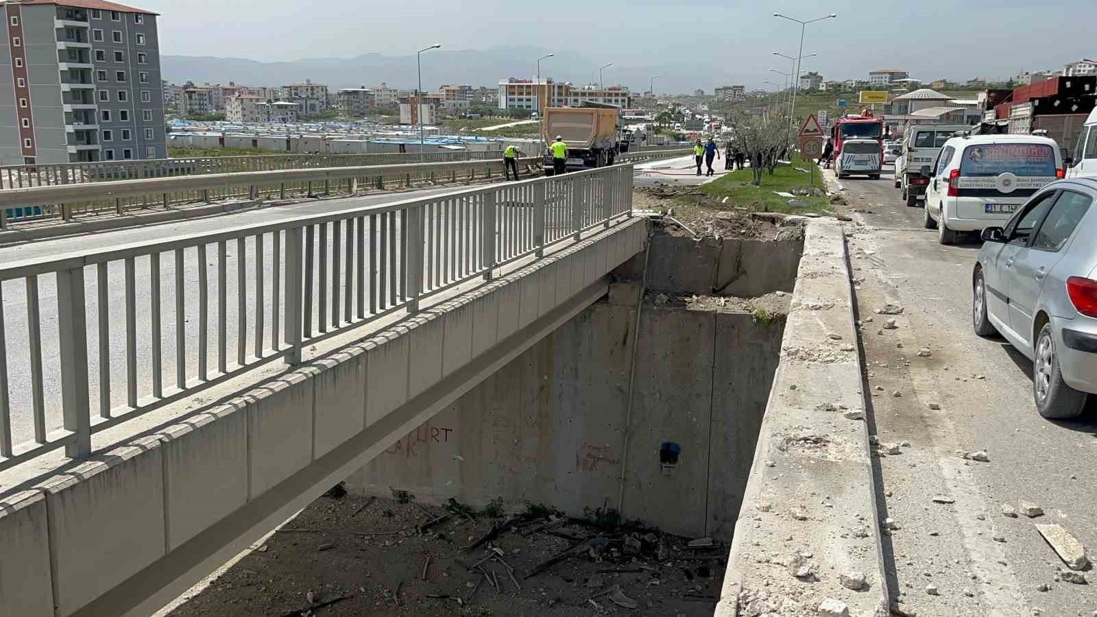 Hatay’da sürücüsünün direksiyon hakimiyetini kaybettiği hafriyat kamyonu, orta bariyeri aşarak ilerlediği esnada uçmaya ramak kala üst geçidin bariyerine çarparak durdu.