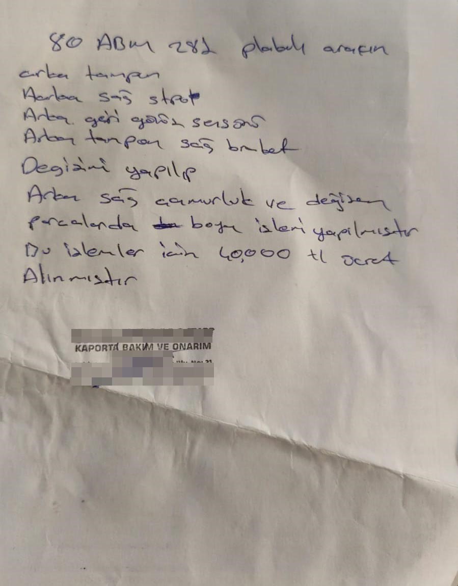 Adana’da 8 Nisan 2024’te 80 ARM 281 plakalı otomobiliyle kazaya karışan Davut Tiken, tutanak sonrası arkadaşının işlettiği kaportacıya gitti. Otomobilinin sağ arka tarafı hasar gören Tiken’in aracına 40 bin TL’lik masraf yapılacağı ve hasar kaydı işlenmeyeceği söylendi. Ancak işlemlerden sonra iddiaya göre Tiken’in aracına 78 bin 29 TL hasar kaydı işlendi ve buna karşılık 18 bin 383 TL ’değer kaybı’ ödendi.