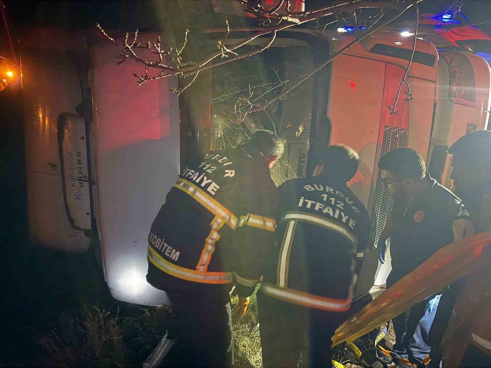 Kaza, saat 22.45 sıralarında Burdur-Antalya karayolu Çatağıl köyü yol ayrımında meydana geldi. Edinilen bilgilere göre Antalya’dan Burdur istikametine seyir halinde olan Ertan Ö. (48) idaresindeki 31 AHZ 516 plakalı hurda demir yüklü Mercedes marka tır, sürücünün direksiyon hakimiyetini kaybetmesi sonucu kontrolden çıkarak şarampole devrildi. Kazada araçta sıkışan sürücü Ertan Ö. yaralandı. Çevredekilerin 112 Acil Çağrı Merkezine ihbarı üzerine olay yerine sağlık, itfaiye, polis ve jandarma ekipleri sevk edildi. Olay yerine gelen itfaiye ekiplerinin çalışmalarıyla araç içinde sıkıştığı yerden çıkarılan sürücü Ertan Ö. sağlık ekiplerinin ilk müdahalesinin ardından ambulans ile Burdur Devlet Hastanesi’ne kaldırıldı. Hastanede tedavi altına alınan Ertan Ö.nün hayati tehlikesi bulunmazken kaza ile ilgili inceleme başlatıldı.