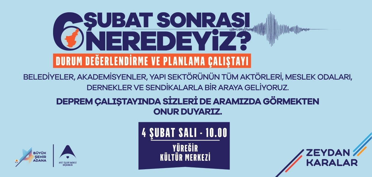 Adana Büyükşehir Belediyesi, 6 Şubat depremlerinin yıldönümü nedeniyle “Deprem Çalıştayı” düzenleyecek. 6 Şubat Sonrası Neredeyiz? Durum Değerlendirme ve Planlama Çalıştayı ile Sonuç Raporu ve Deprem Değerlendirme Forumu 4 Şubat Salı günü gerçekleştirilecek.
