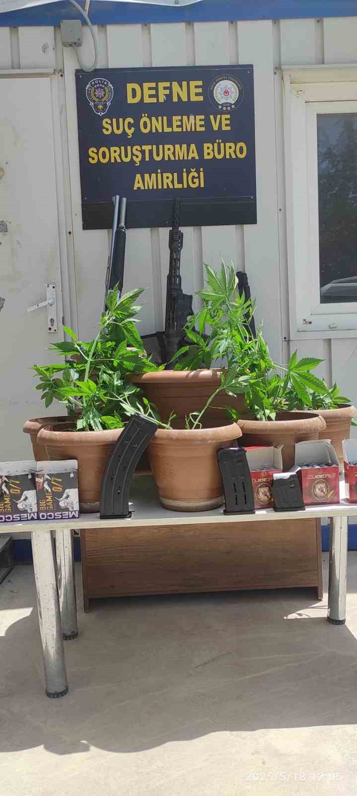 Hatay’ın Defne ilçesinde bir ikamette yapılan aramada saksılar içerisinde Hint keneviri bitkisi, 3 adet ruhsatsız tüfek ile çok sayıda fişek ele geçirilirdi.
