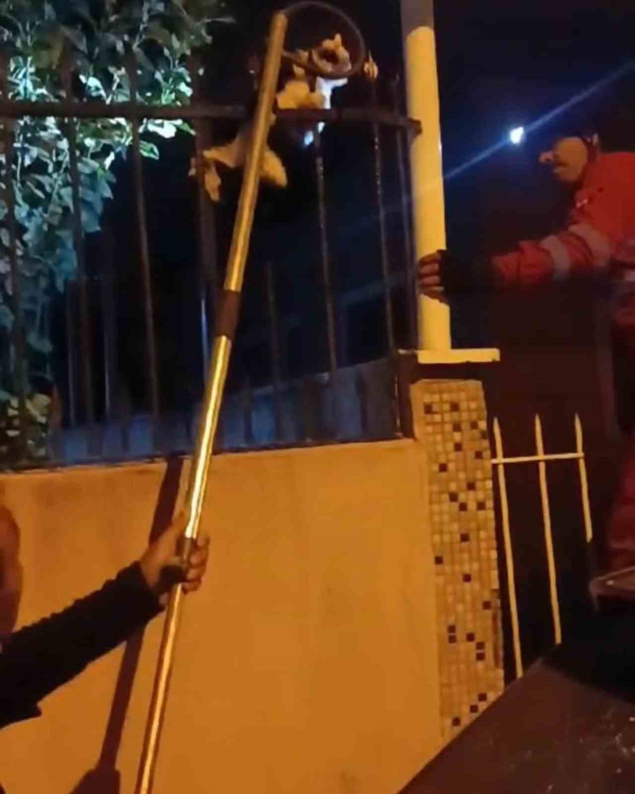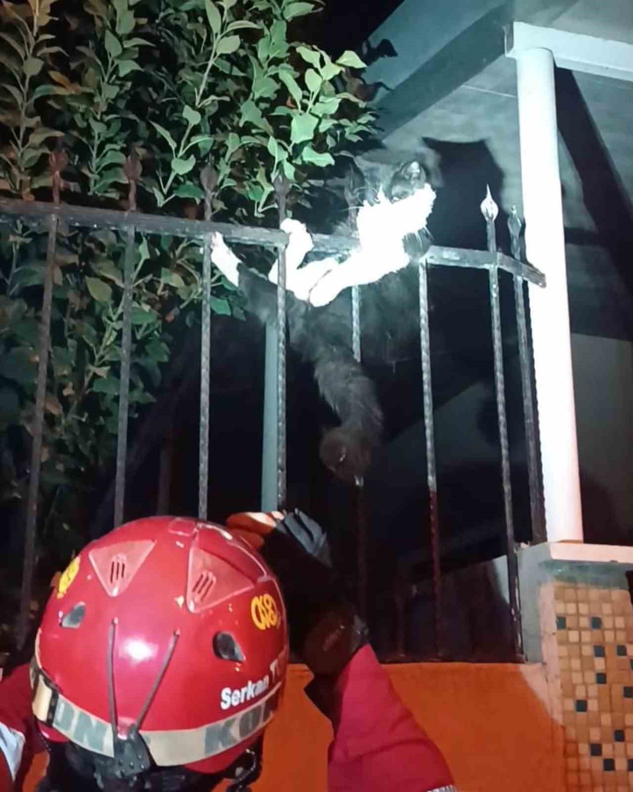 Hatay’da demir korkuluklara sıkışan kedi, itfaiye ekiplerinin müdahalesiyle kurtarıldı.