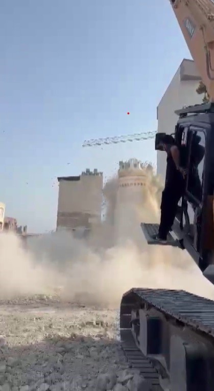 Hatay’ın Kırıkhan ilçesinde depremde ağır hasar alan minarenin, iş makinesinin darbesiyle yerle bir olduğu anlar kameraya yansıdı.