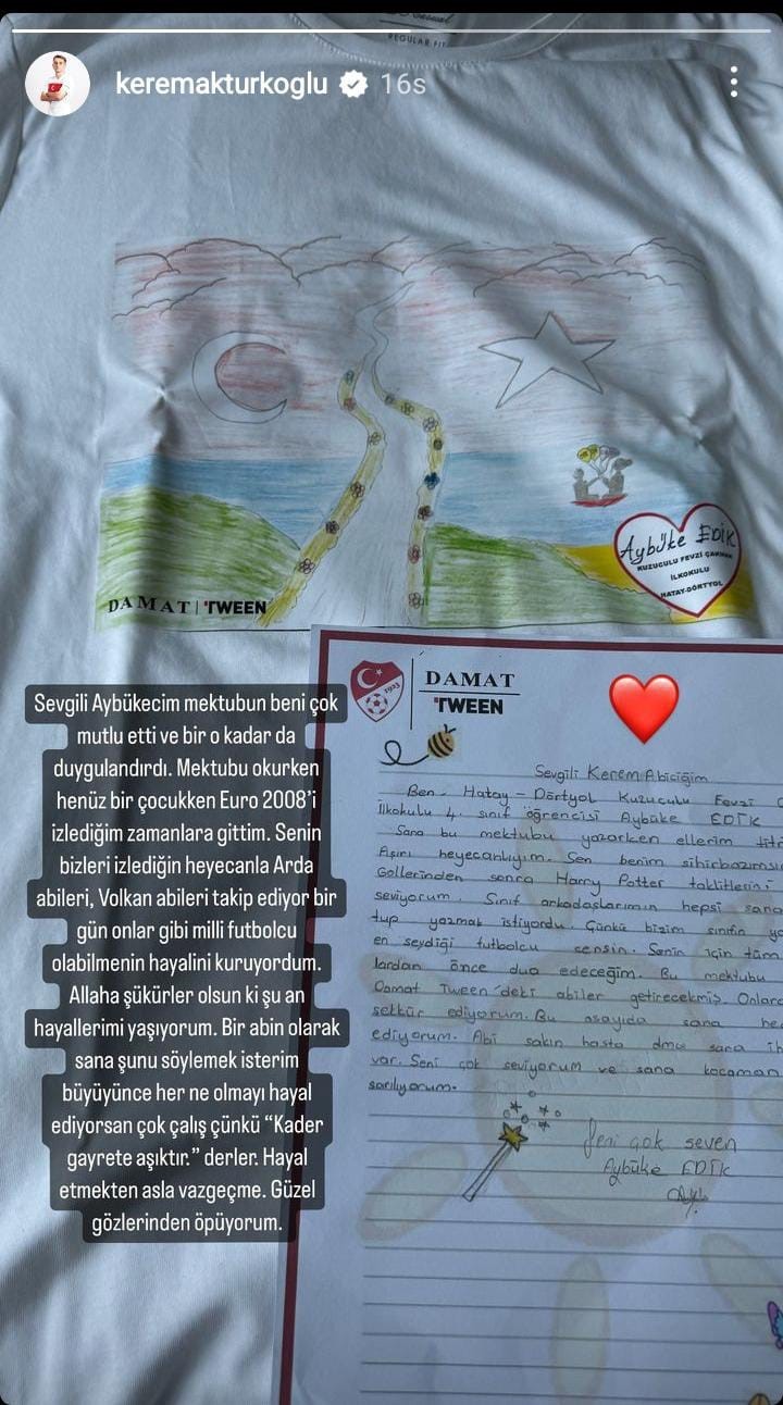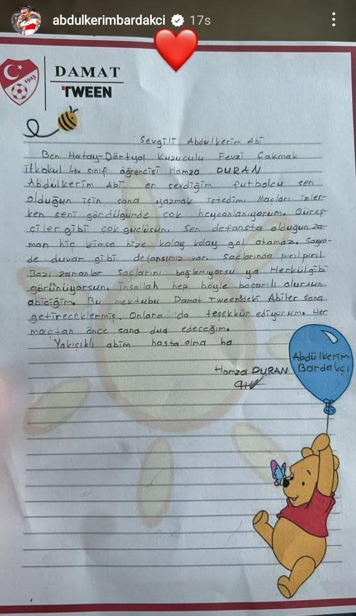 Milli futbolcu Abdülkerim Bardakçı’ya mektup yazan 11 yaşında Hamza Duran ise “Mektubu yazarken ve çok heyecanlandım. Benim mektubumu paylaştıklarına inanamadım, zaten hayranıyım Abdülkerim abinin. Herkül gibi defansta dur gol yemeyelim, bizi mutlu et yazdım. Çok iyi bir maç çıkarmalarını bekliyorum” şeklinde konuştu.