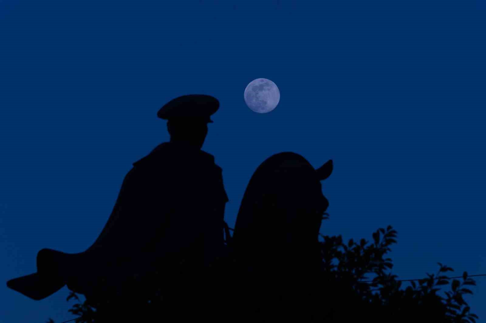 Antakya ilçesinde geçtiğimiz gece havanın açık olmasıyla birlikte dolunay gökyüzünde adeta parladı. Cumhuriyet Meydanı’nda Atatürk heykeli ile dolunay manzarası aynı kadrajda muhteşem bir görüntü oluşturdu. Amanos Dağları üzerinden doğan dolunay, Atatürk heykeli üzerinde kartpostallık görüntüler oluşturdu.