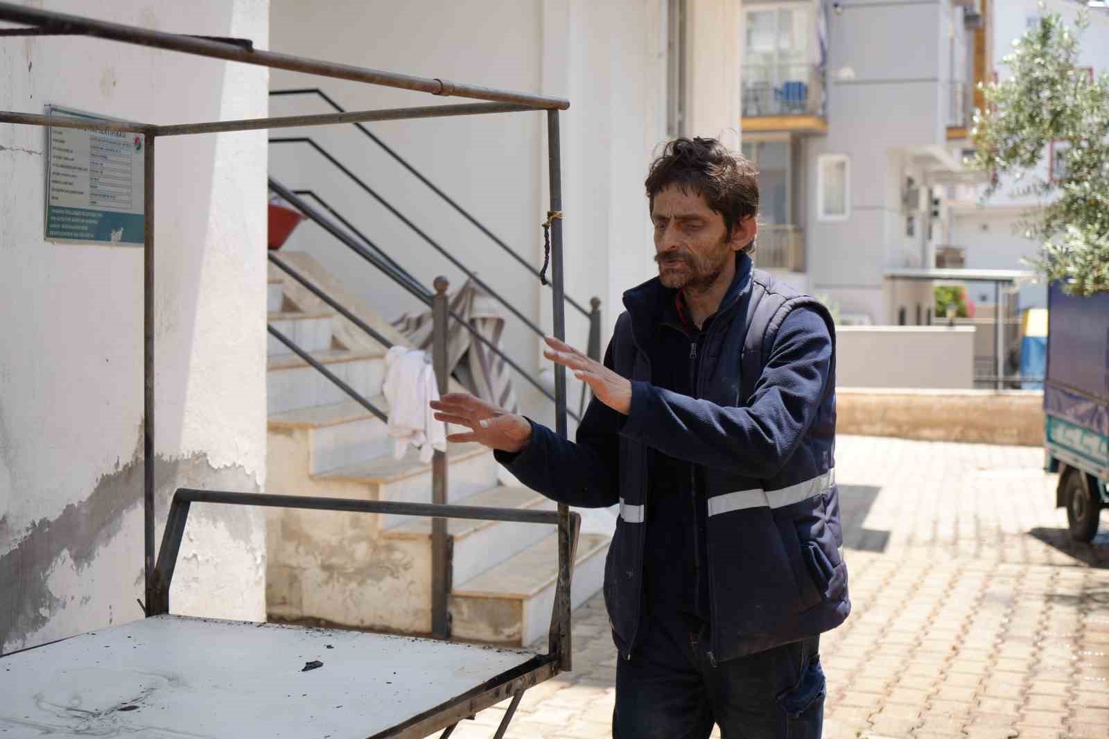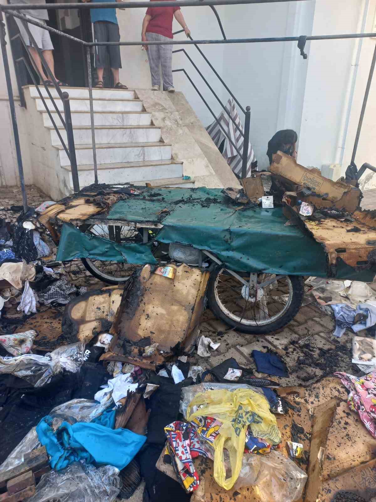 Antalya’da bir vatandaşın apartman önüne bıraktığı el arabasındaki tekstil ürünleri yandı.