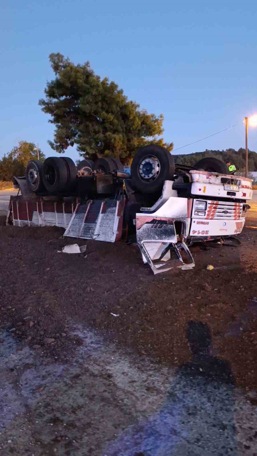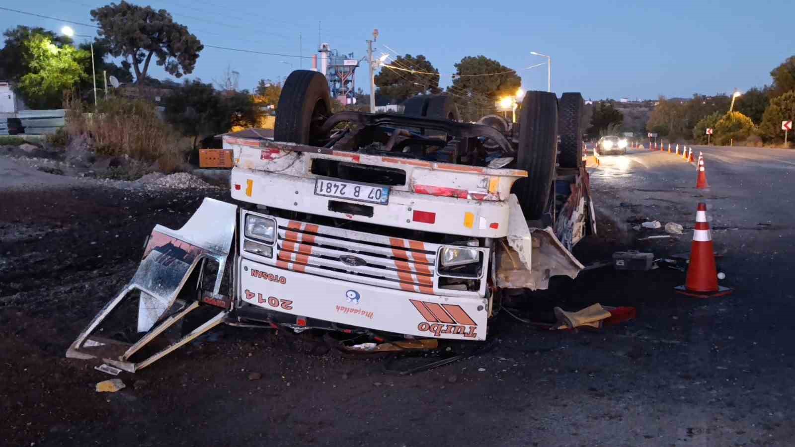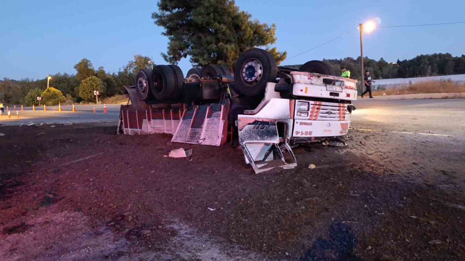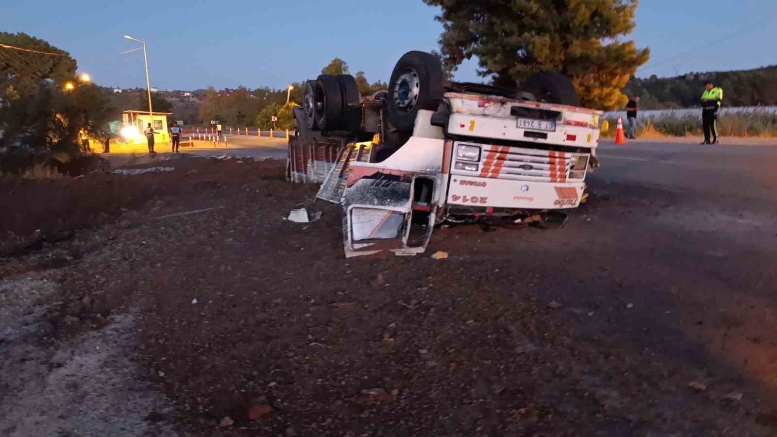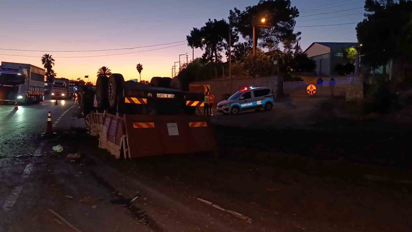 Antalya’da freni patlayan gübre yüklü kamyon Jandarma ve Polisin ortak uygulama noktasına dalarak devrildi. Yol Kontrol Noktasında görevli Jandarma ve Polis ekiplerinin kamyonu erken fark etmeleri sayesinde facianın eşiğinden dönüldü.