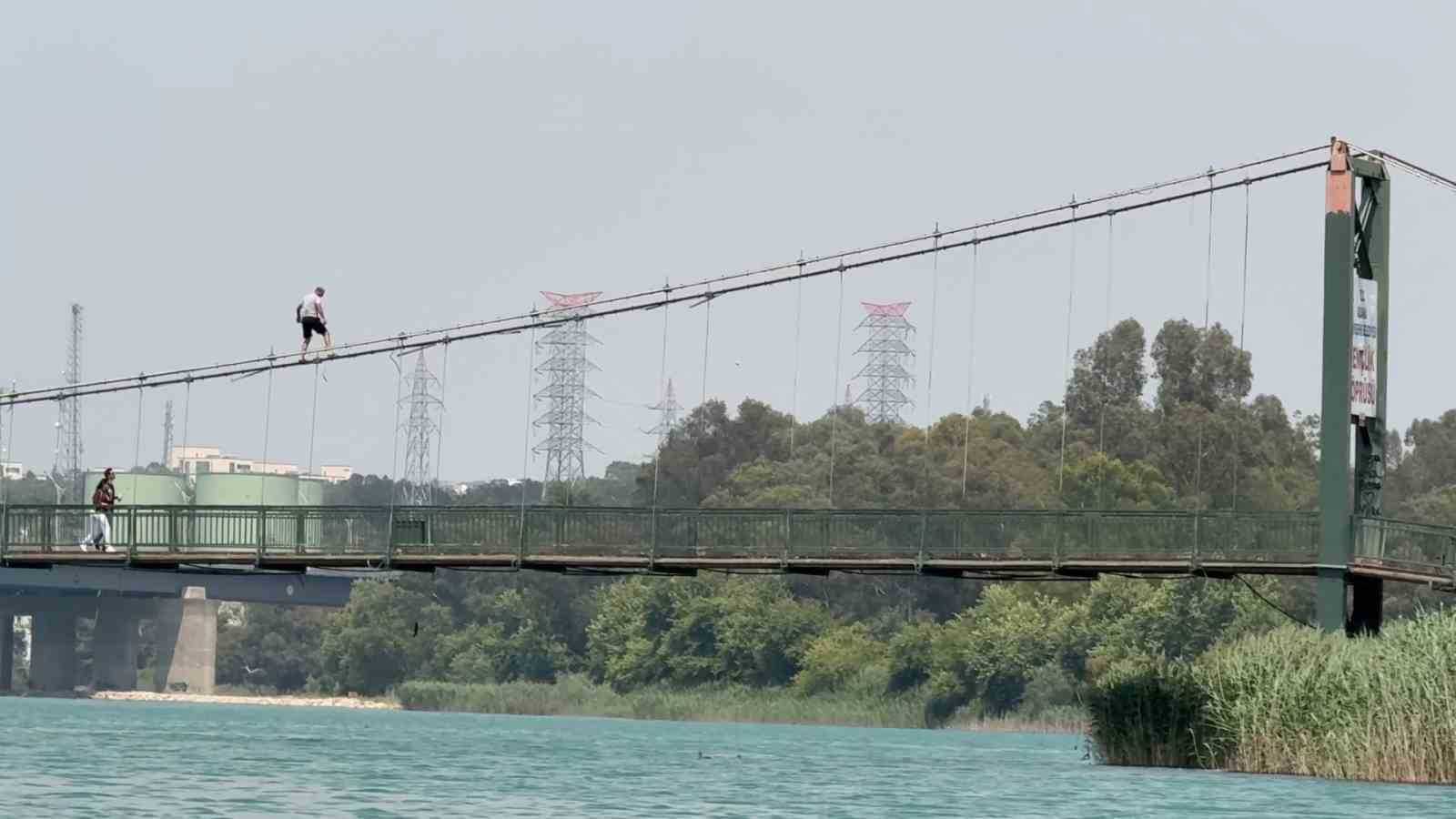 Adana’da etkili olan sıcaklar nedeniyle gençler, serinlemek için Seyhan Nehri üzerindeki Gençlik Köprüsü’nün halatlarına tırmanarak suya atladı. Tehlikeli o anlar ise kameraya yansıdı.