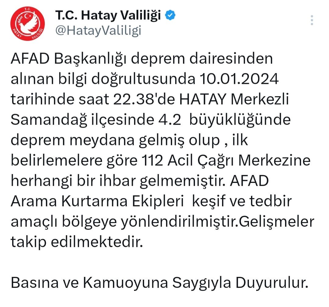 Hatay Valiliğinden depremle ilgili yapılan açıklamada, “AFAD Başkanlığı deprem dairesinden alınan bilgi doğrultusunda 10 Ocak 2024 tarihinde saat 22.38’de Hatay Merkezli Samandağ ilçesinde 4.2 büyüklüğünde deprem meydana gelmiş olup, ilk belirlemelere göre 112 Acil Çağrı Merkezi’ne herhangi bir ihbar gelmemiştir. AFAD Arama Kurtarma Ekipleri keşif ve tedbir amaçlı bölgeye yönlendirilmiştir. Gelişmeler takip edilmektedir” ifadelerine yer verildi.