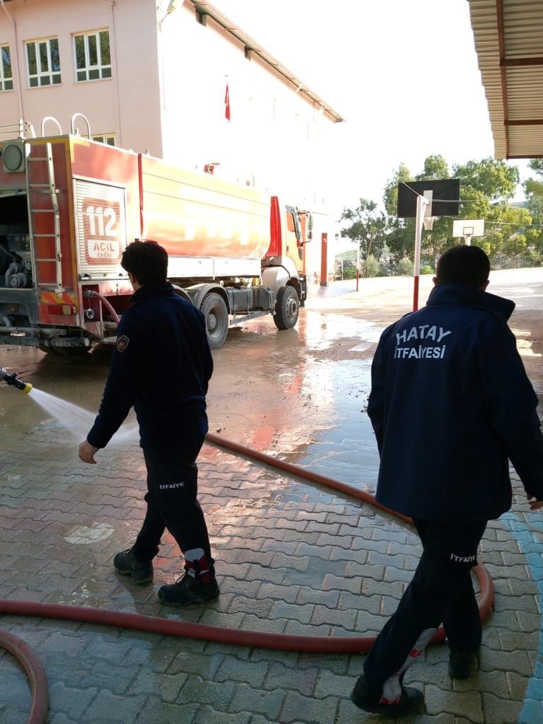 Hatay’da itfaiye ekipleri okul bahçesini çamurdan arındırdı