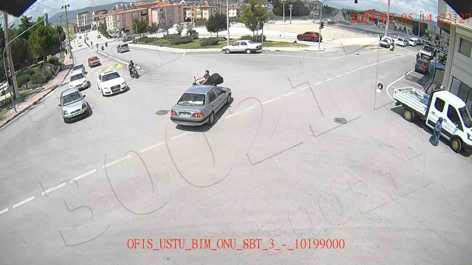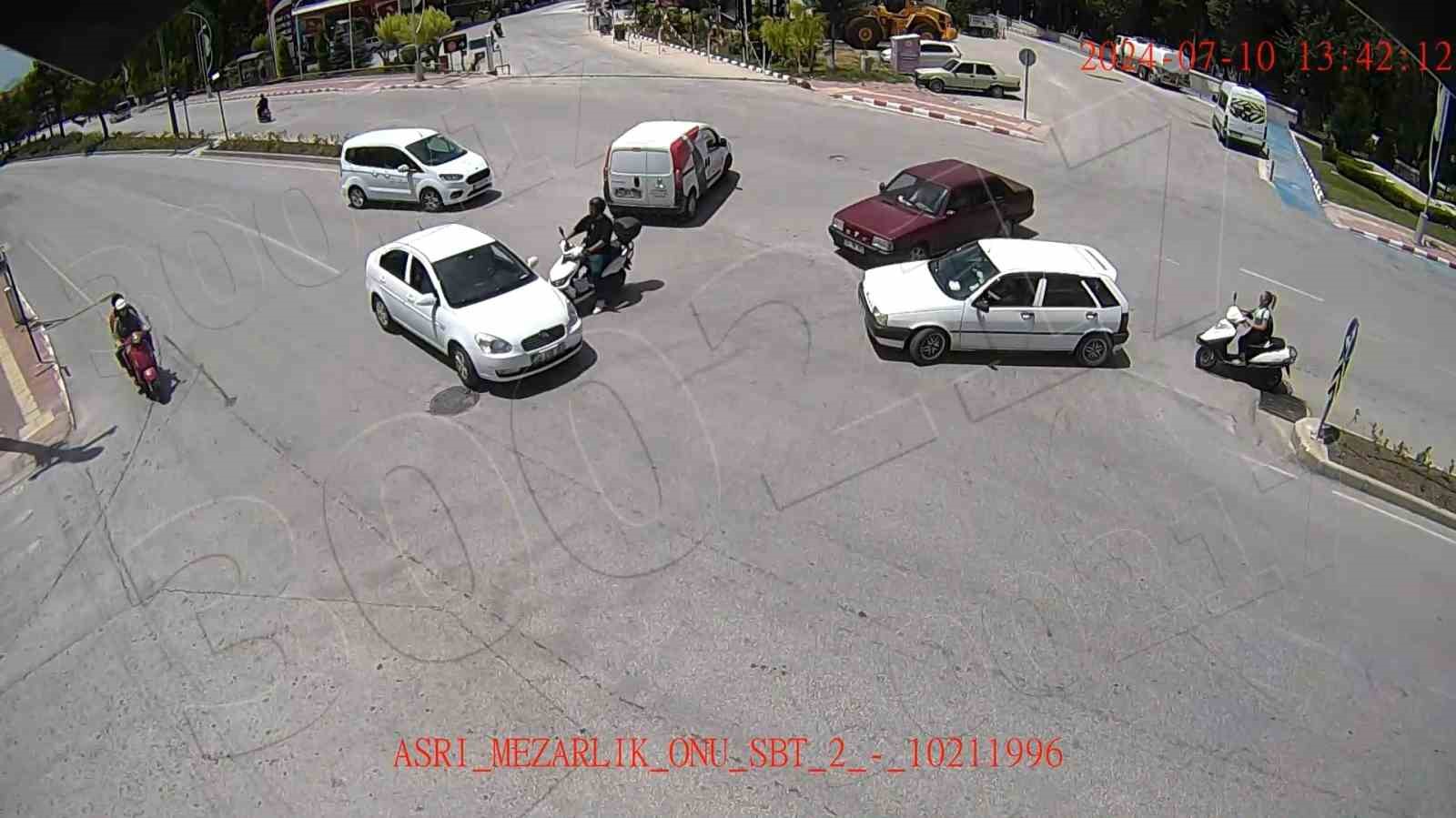 Görüntülerdeki son kaza ise Güzelleştirme Caddesi üzerinde gerçekleşiyor. Cadde üzerinden gelerek kavşakta Höyük Sokağa kontrolsüz bir şekilde dönmek isteyen otomobil karşı şeritten gelen motosikletli kuryeye çarpıyor. Kurye bu kazayı hafif sıyrıklarla atlatıyor.