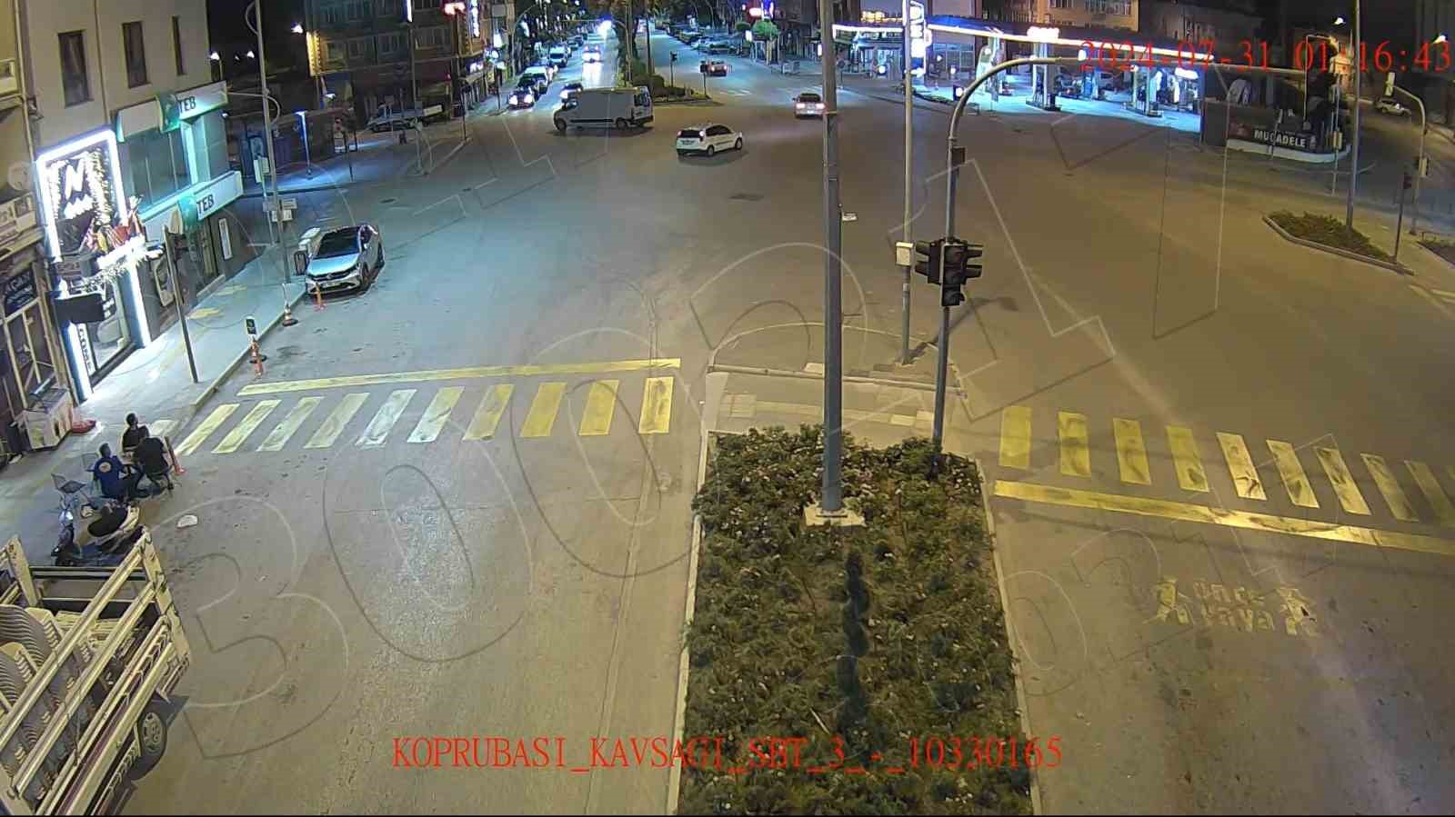 Görüntülerde ki birinci kazada Mehmet Akif Caddesi üzerinden Köprübaşı Kavşağına giren panelvan aracın İsmet İnönü Bulvarında kırmızı ışıkta beklerken yeşil ışık yanmasının üzerine harekete geçen Ford otomobile çarpması ile meydana geldiği görülüyor. Panelvanın çarptığı otomobil ise çarpmanın etkisi ile yön değiştirerek tekrar İsmet İnönü Bulvarı’na dönüyor. Kaza maddi hasar ile atlatılıyor.