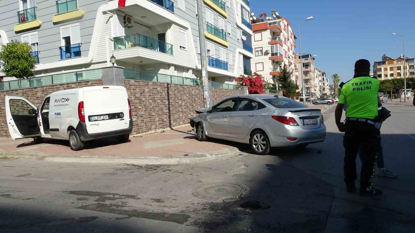 Kaza, dün öğle saatlerinde Konyaaltı ilçesi Liman 39 Sokak üzerinde meydana geldi. Edinilen bilgiye göre, sürücülerinin isimleri öğrenilemeyen 34 AHB 630 plakalı Fiat marka hafif ticari araç ile 34 PT 2396 plakalı Hyundai marka otomobil çarpıştı. Çarpışmanın etkisiyle her iki araç da kaldırıma çıktı; otomobil aydınlatma direğine, diğer araç ise bir sitenin bahçe duvarına çarparak durabildi. Çevredekilerin ihbarı üzerine olay yerine, itfaiye, polis ve sağlık ekipleri sevk edildi.