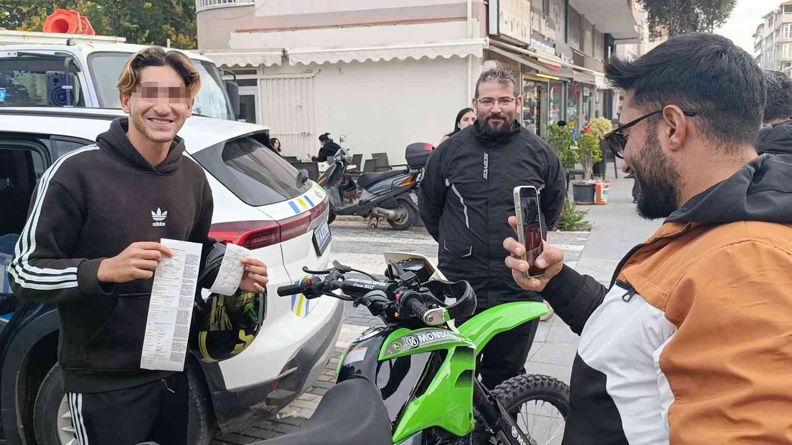 Antalya’nın Manavgat ilçesinde okul servisinden inen 11 yaşındaki öğrenci karşıdan karşıya geçerken plakasız bir motosikletin çarpmasıyla yaralandı. Kazaya karışan motosiklet sürücüsünün, sürücü belgesinin olmadığı ve motosikletinin plakasız olduğu tespit edilerek, trafik ekipleri tarafından kendisine toplam 23 bin 894 TL para cezası kesildi. Trafik ekipleri tarafından ceza uygulanması sırasında bugüne kadar sürücü belgesiz kullandığı halde ceza yemediğini belirten motosiklet sürücüsü, ilk kez yediği cezanın makbuzuyla hatıra fotoğrafı çektirdi.