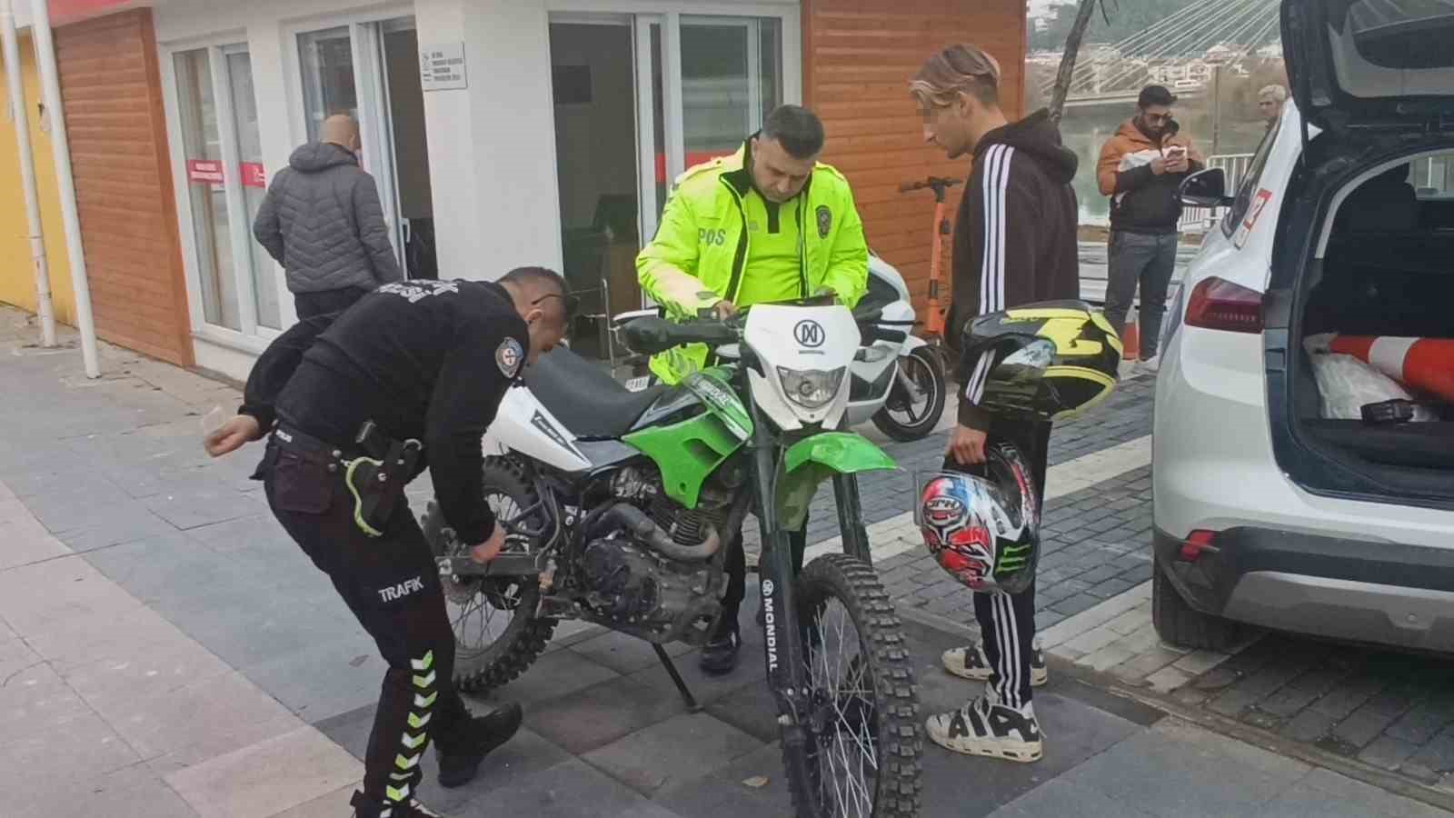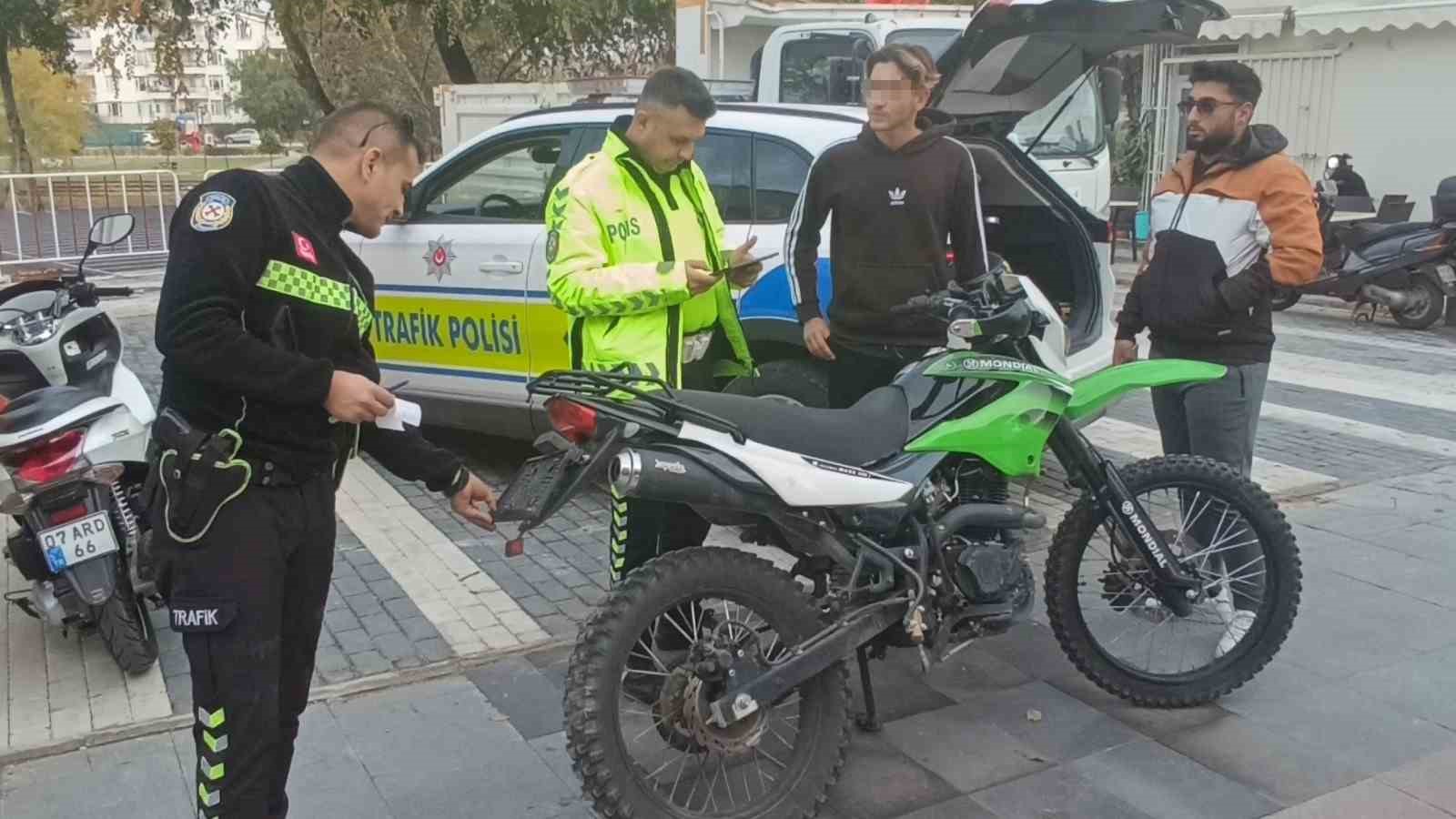 Manavgat Emniyet Müdürlüğü Trafik Denetleme Büro Amirliği ekiplerince motosiklet sürücüsüne sürücü belgesinin olmaması nedeniyle 12 bin 977 TL, motosikletin plakasının olmamasından 10 bin 917 TL olmak üzere toplam 23 bin 894 TL para cezası uygulandı ve motosiklet bağlanarak yediemin otoparkına çekildi.