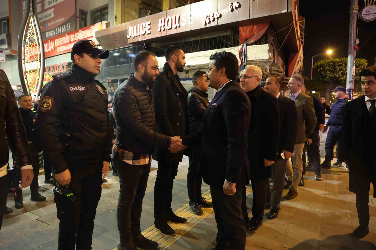 Kaymakam Demiryürek ve İlçe Belediye Başkanı Tosyalı alandan ayrılırken İskenderun İlçe Emniyet Müdürü Nevzat Güneş, beraberindeki polis ekipleriyle şehrin yoğun olduğu bölgedeki esnaf ve halkın yeni yılını kutladı.