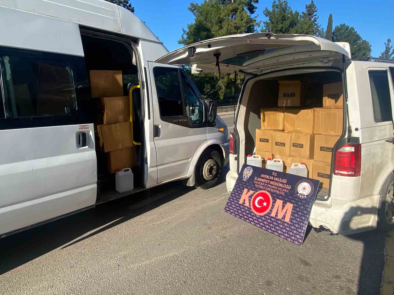 Kepez, Muratpaşa, Alanya, Manavgat ilçelerinde yapılan operasyonlarda, 70 bin boş/dolu makaron, 3 bin 535 litre kaçak içki, 670 paket kaçak sigara, 385 kilogram kaçak tütün ile 276 adet kaçak elektronik sigara ele geçirildi.