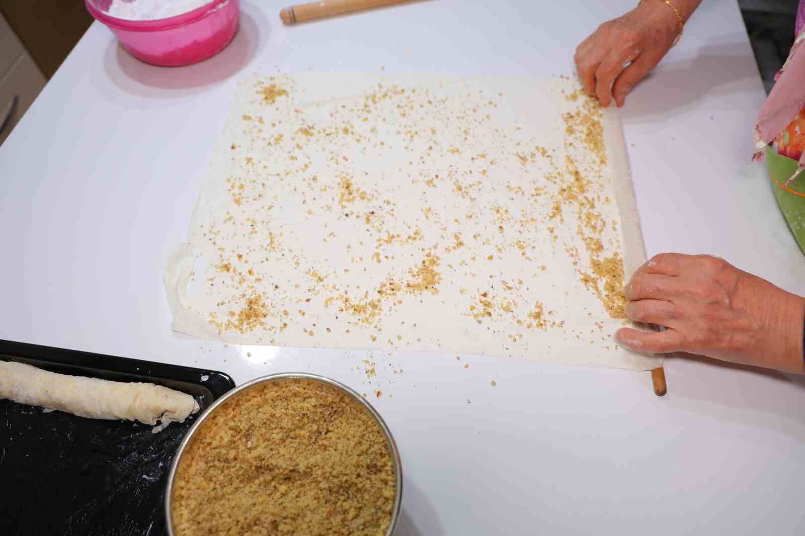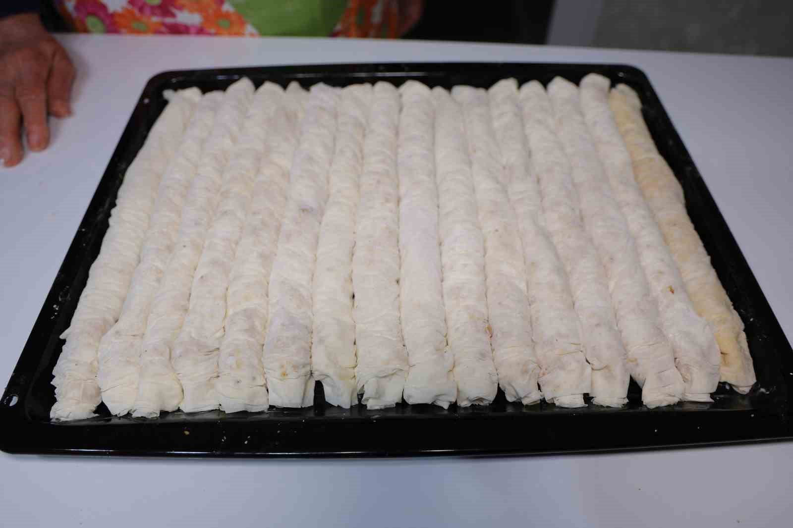 Tatlı yapımının detaylarını anlatan Karageçen, “Hamuruna yumurta, süt, sıvı yağ ve tereyağı ekleyerek yoğuruyoruz. Dinlendirdikten sonra küçük bezelere ayırıp incecik açıyoruz. Ardından oklavaya sarıp kıvırarak şekil veriyoruz. İçine ceviz koyup üzerine de tereyağı ya da zeytinyağı gezdiriyoruz. Piştikten sonra şerbetini döküp fıstık tozuyla süslüyoruz. Her bayram yapıyoruz. Misafirlerimize, çocuklarımıza ikram ediyoruz. Allah sağlıkla yemeyi nasip etsin” diye konuştu.
