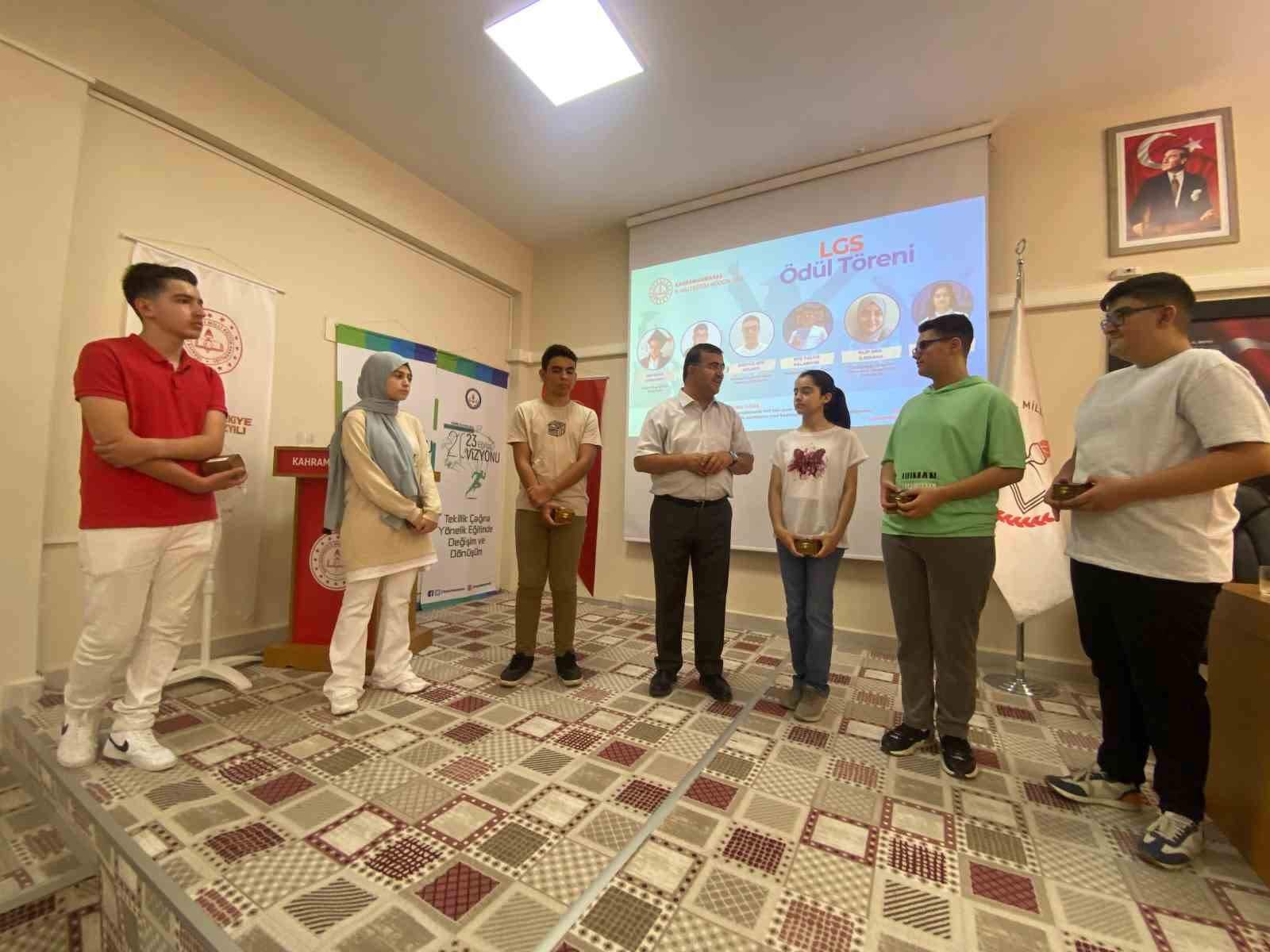 LGS birincilerinin bu başarısı Kahramanmaraş İl Milli Eğitim Müdürlüğü tarafından ödüllendirildi. İl binasında gerçekleştirilen organizasyonda LGS birincileri Efe Talha Palabıyık, Metehan Gümüşsoy, Muhammet Enes Kurucu, Sertuğ Efe Gülden, Elif Eda Erderha ve Betül Bera Çakıcı çeşitli hediyelerle ödüllendirildi.